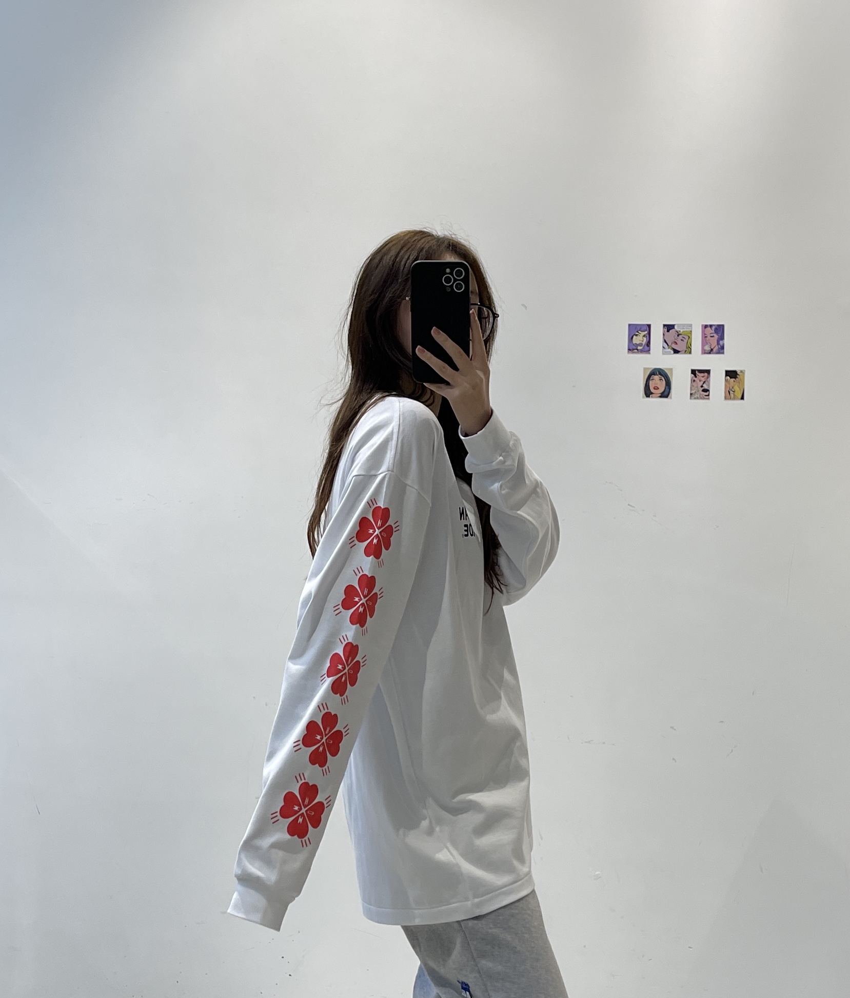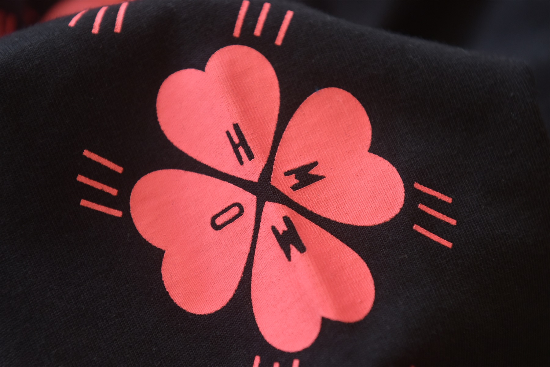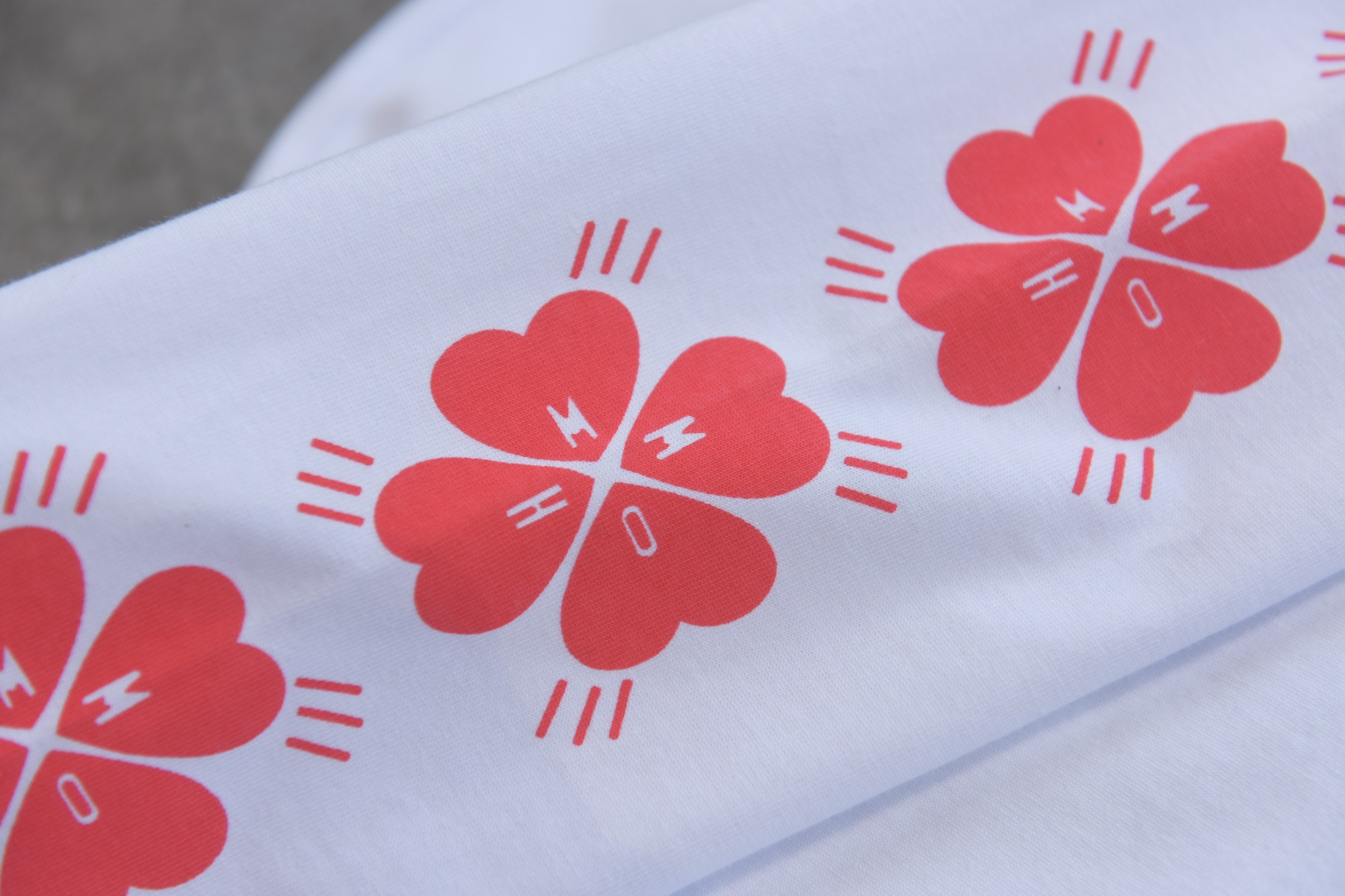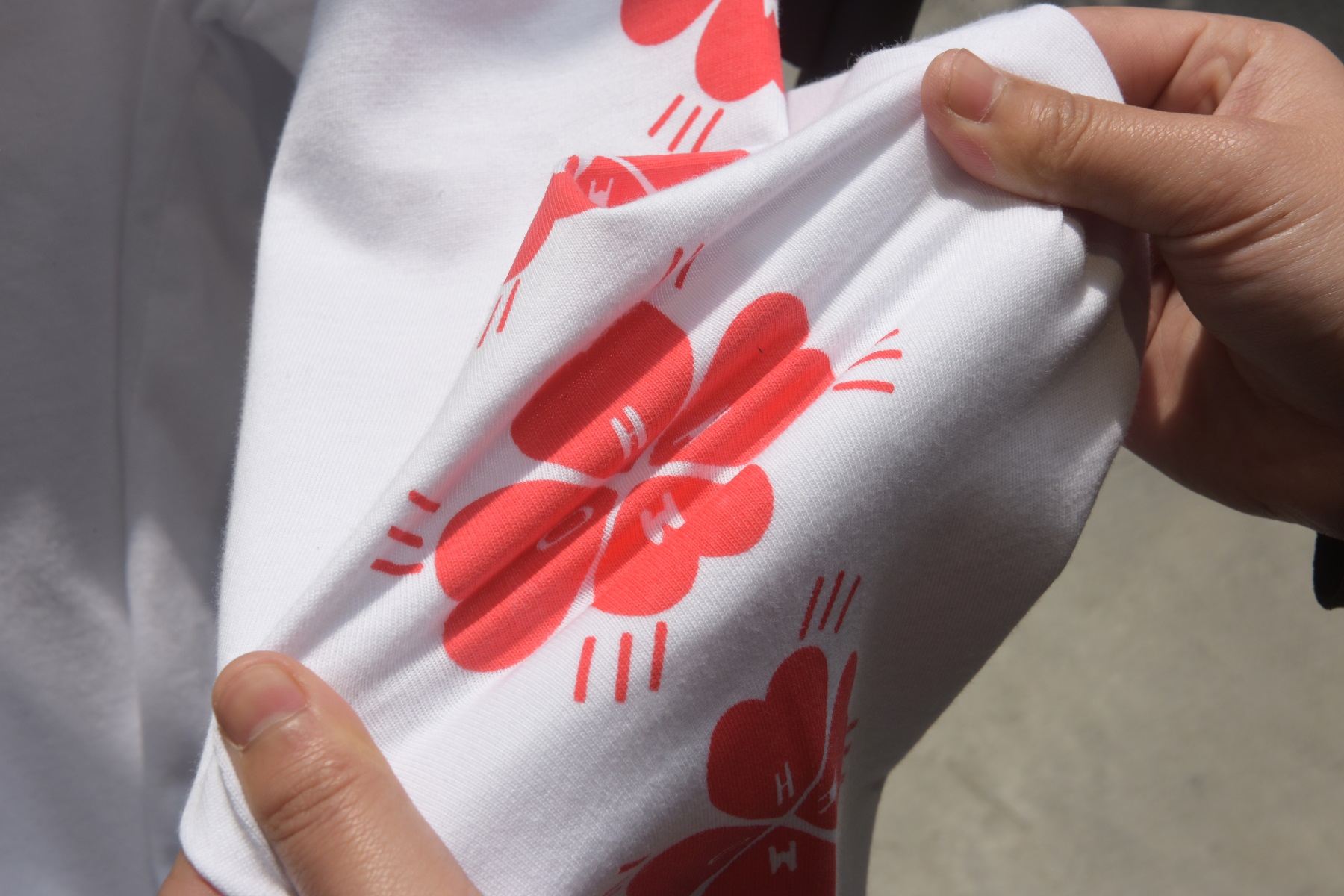 另一件袖子上印着由人造花心形标志组成的四叶草图案