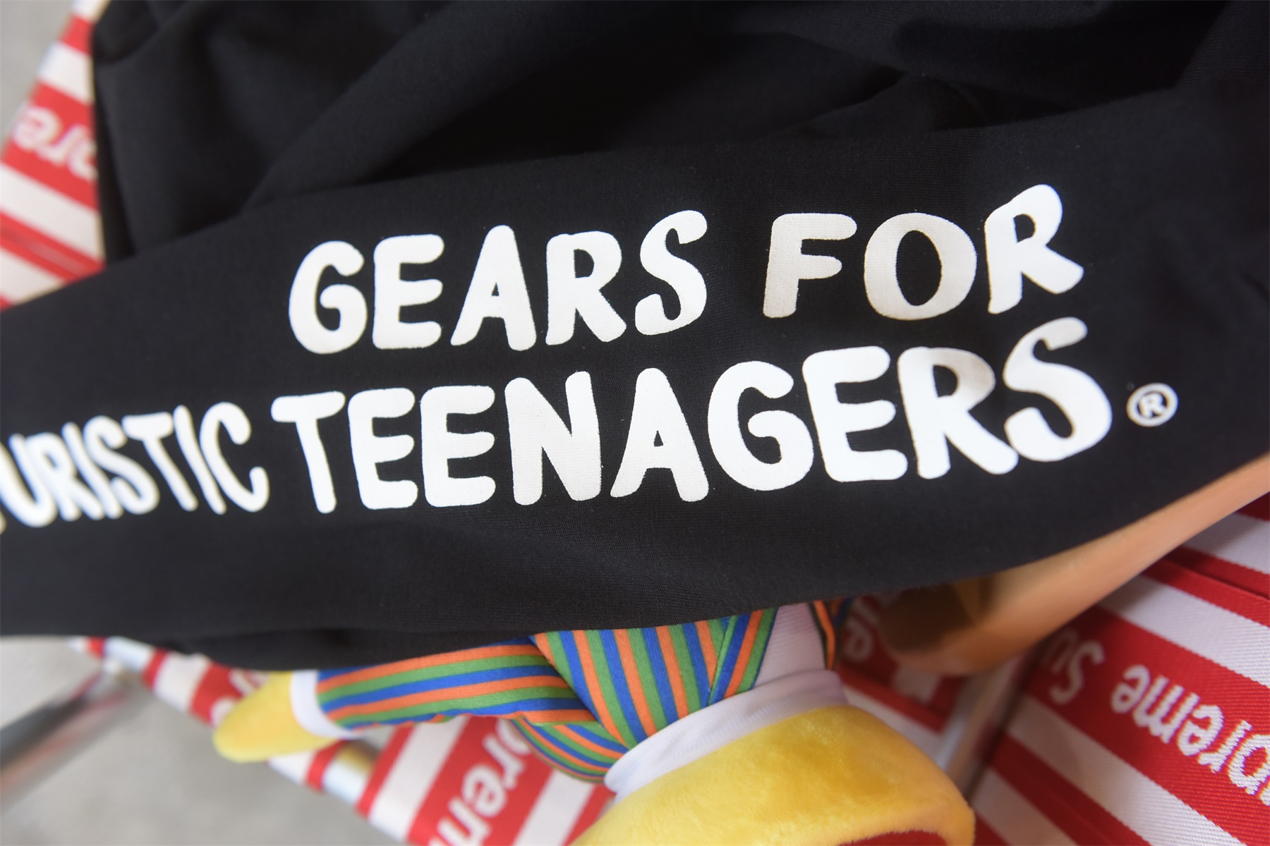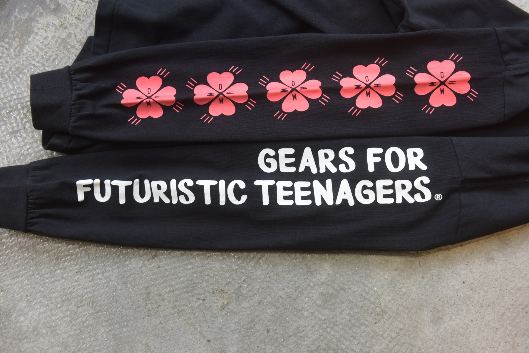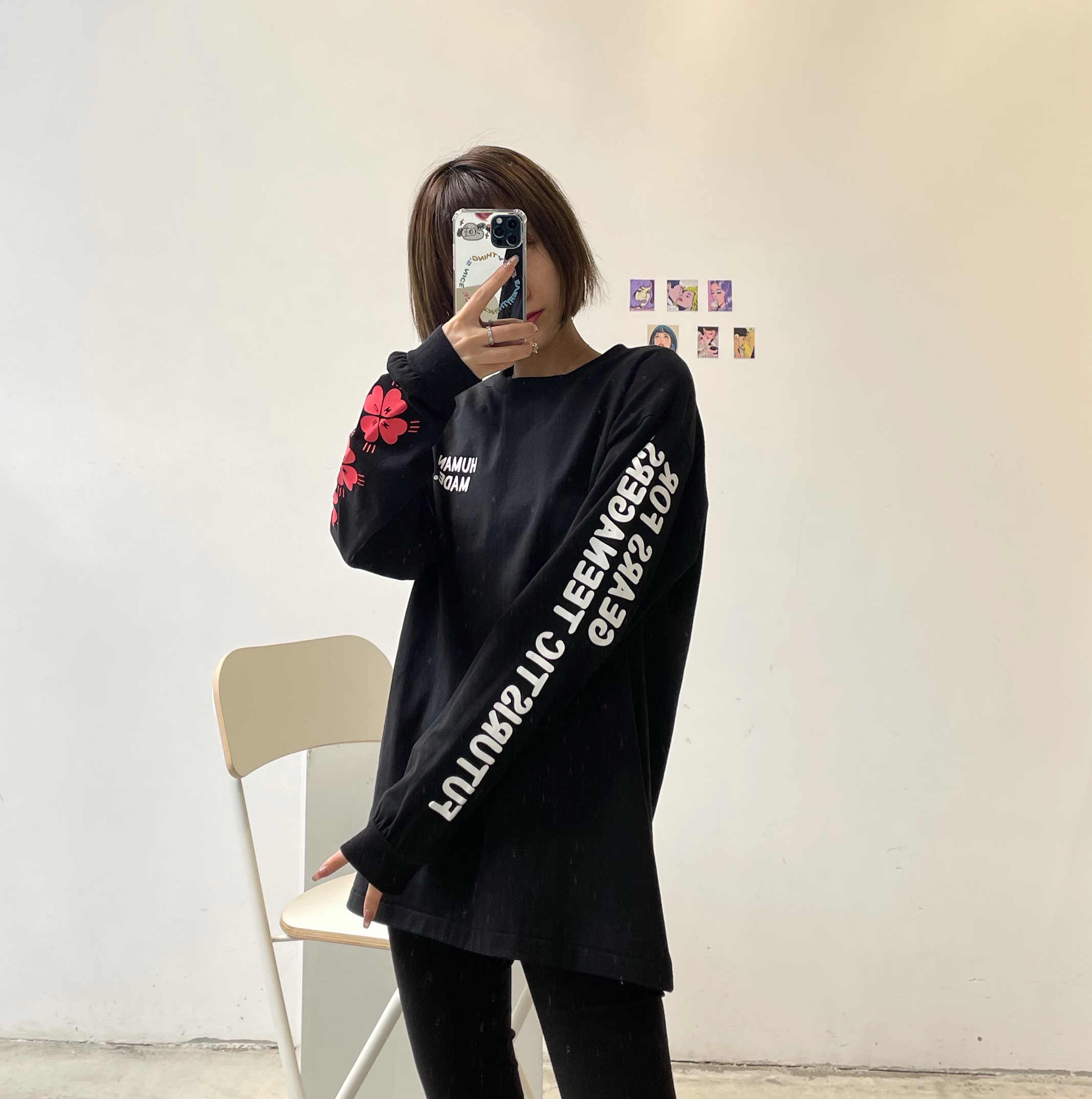 一件长袖t恤的袖子上印着未来主义青少年的口号,