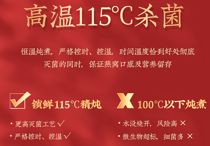 为了保持鲜炖燕窝的口感和营养,全部采取的高温115°C杀菌,恒温炖煮,严控温度,冷链密封配送,锁住新鲜,完好的保留了燕窝的口感和营养留存。