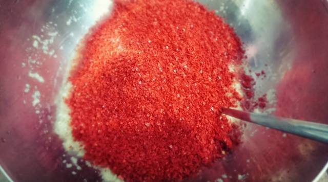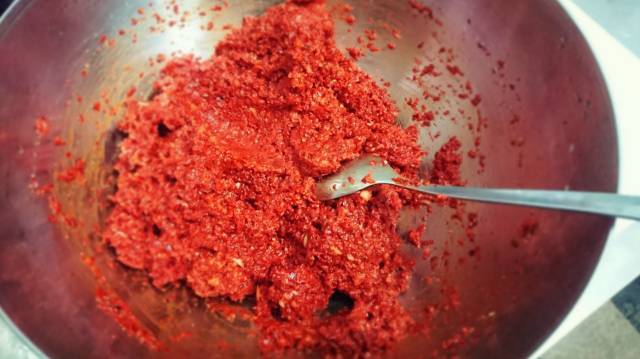 3)倒入鱼露、辣椒面,搅拌均匀,再把香菜籽、韭菜籽、苏子籽炒干碾粉,放进去;