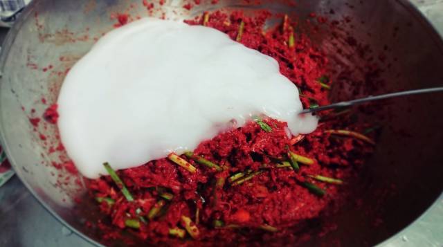 5)3两糯米粉配9两开水,做成糯米糊,倒入碗中,搅拌均匀,腌料就做好了。