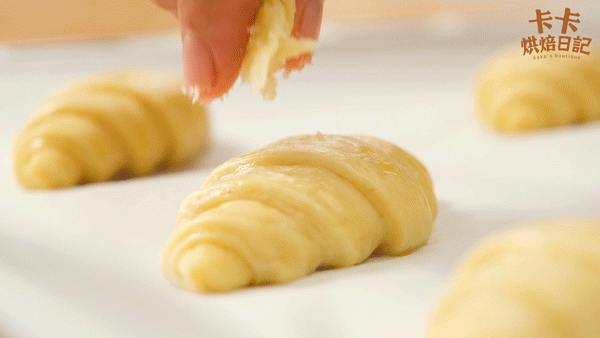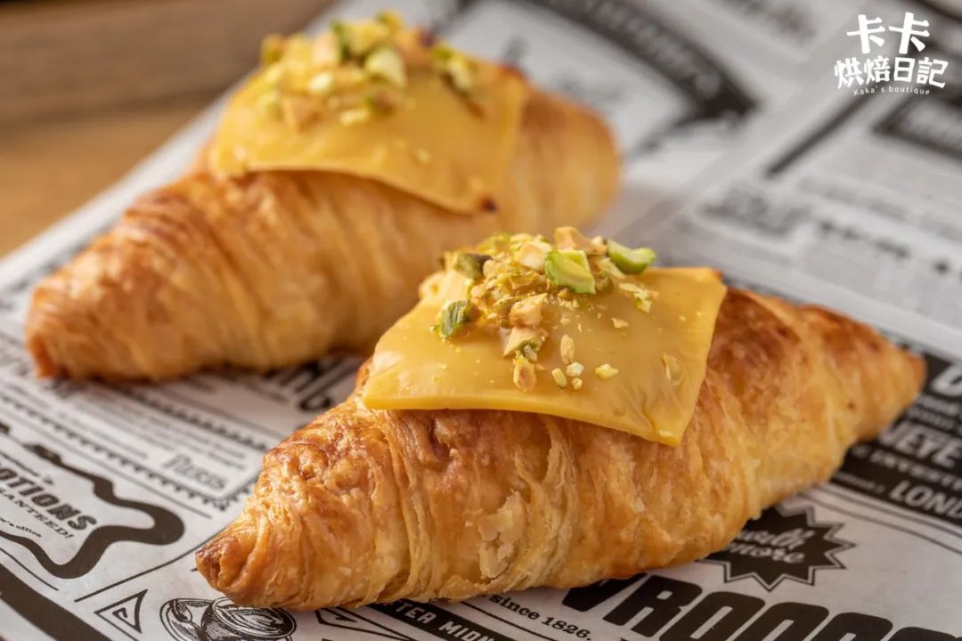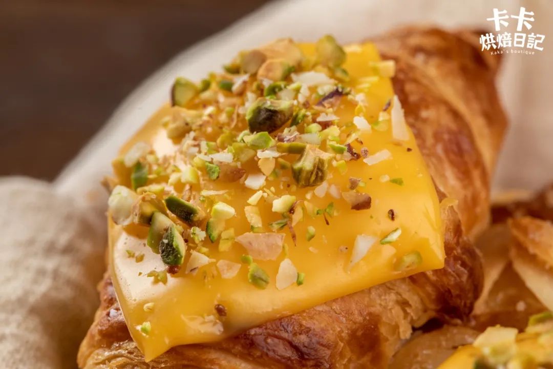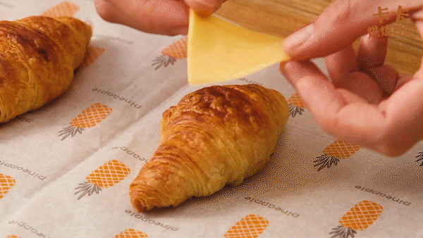 起司,就是人人都爱的芝士啦,把它铺在可颂表层,经过烘烤,芝士融化呈现金黄的诱人色泽。