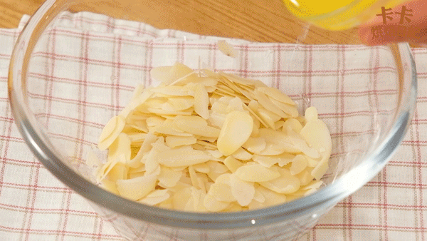 2、将黄油融化成液体,倒入杏仁片中,用筷子轻轻拌匀,倒入细砂糖,混合均匀即可