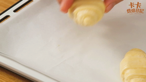 1、将可颂从冰箱中取出,放在铺好纸的烤盘上,常温解冻30-40分钟