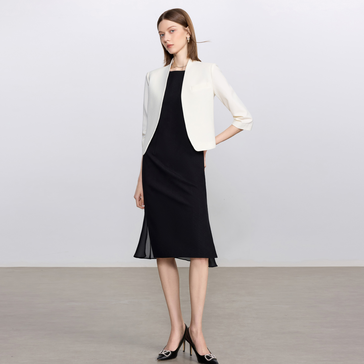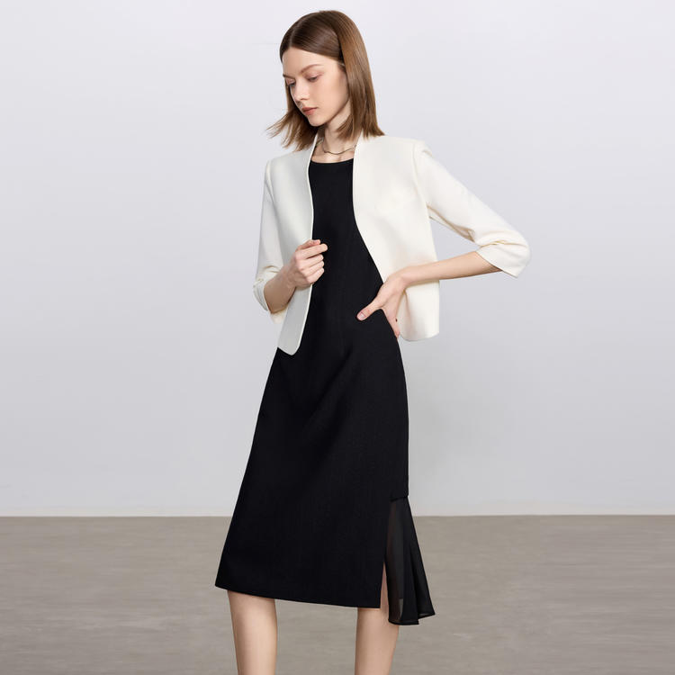 谁还在穿刻板西装套裙?这套 米白无领西装+黑纱开叉裙 打破沉闷的温柔杀 直接把「高级松弛感」玩出花
