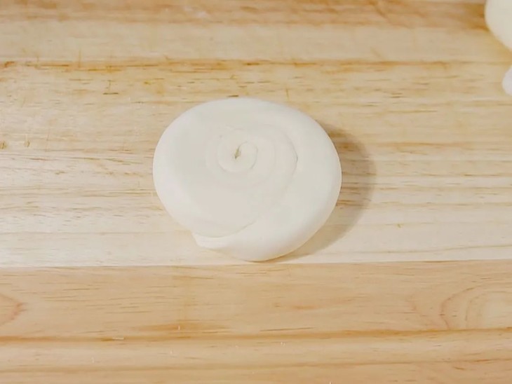 3.取一个面团擀成牛舌状,中间对折,并卷起,将收尾按压在底部中间;