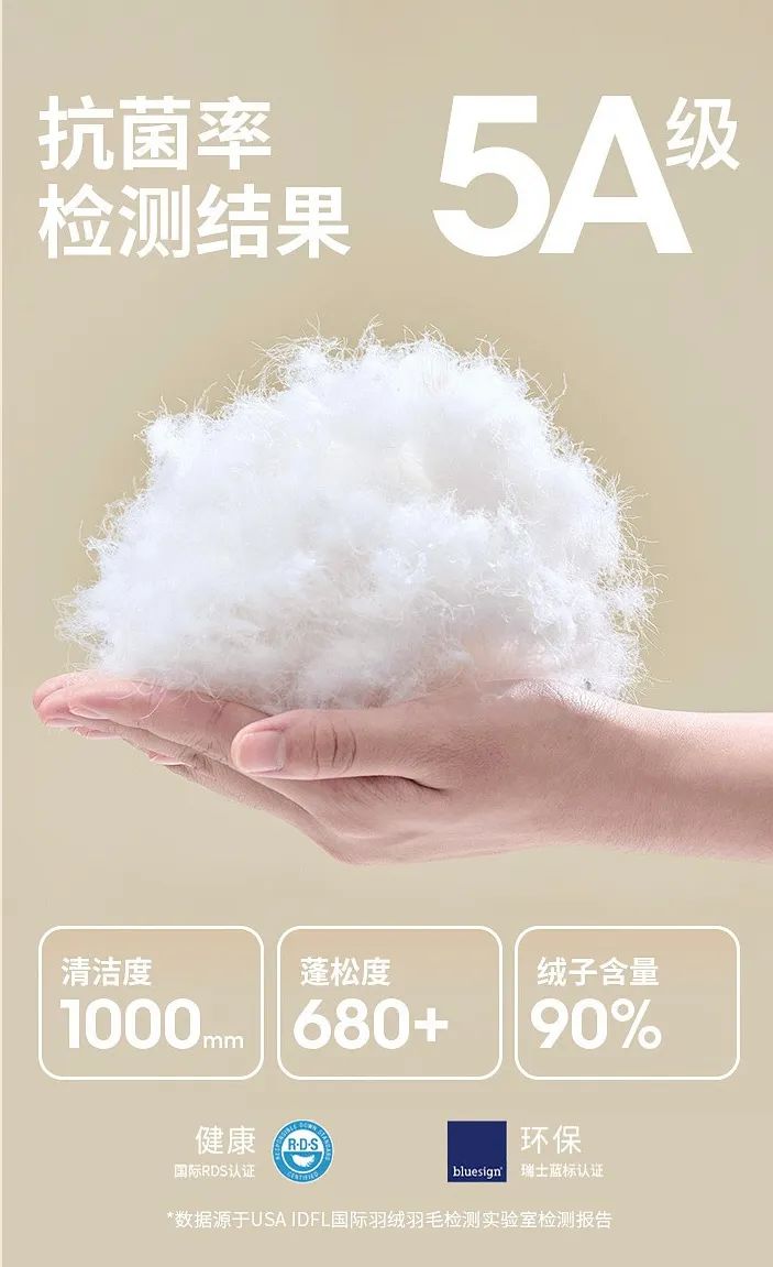 采用的羽绒都是精选自白鸭腹部,绒毛最细腻、洁白的部位,它呈特别的芦花状,密布千万个细小气孔,能随气温变化而收缩膨胀,从而进行调温。