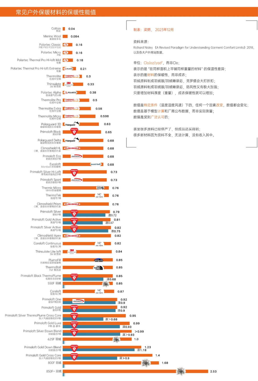 ▲常见服装面料的克罗值。来自户外博主梁燃的整理。