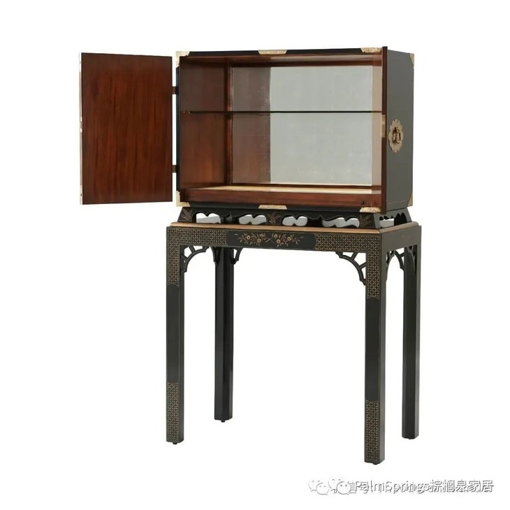 这是一款来自TA中国风手工髹饰展示柜,依照乔治三世时期原型打造,巴西胡桃木材质,整体涂装巧克力色。柜子顶端以黄铜透雕圆环装饰带,细节精雕细琢惟妙惟肖,工艺繁复构思巧妙,在深色柜身的映衬下,美轮美奂。表面的画作是在光滑的漆面上,用黏稠厚漆加炭粉、漆灰等材料进行的堆砌,然后在高起的纹样上再加以装饰不同层次的几种漆色互相交叠,堆成的花纹侧面显露出有规律的色层,画作是充满东方风情的山水人物画,两边采用了苏式园林风的窗棂装饰,让整个柜子通透清爽,让空间的氛围和画中垂钓的时光一样悠然自得