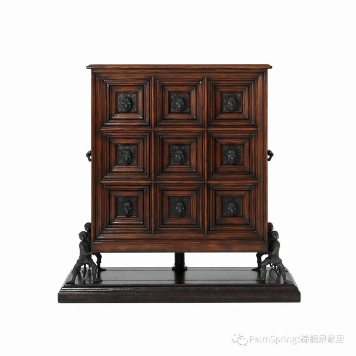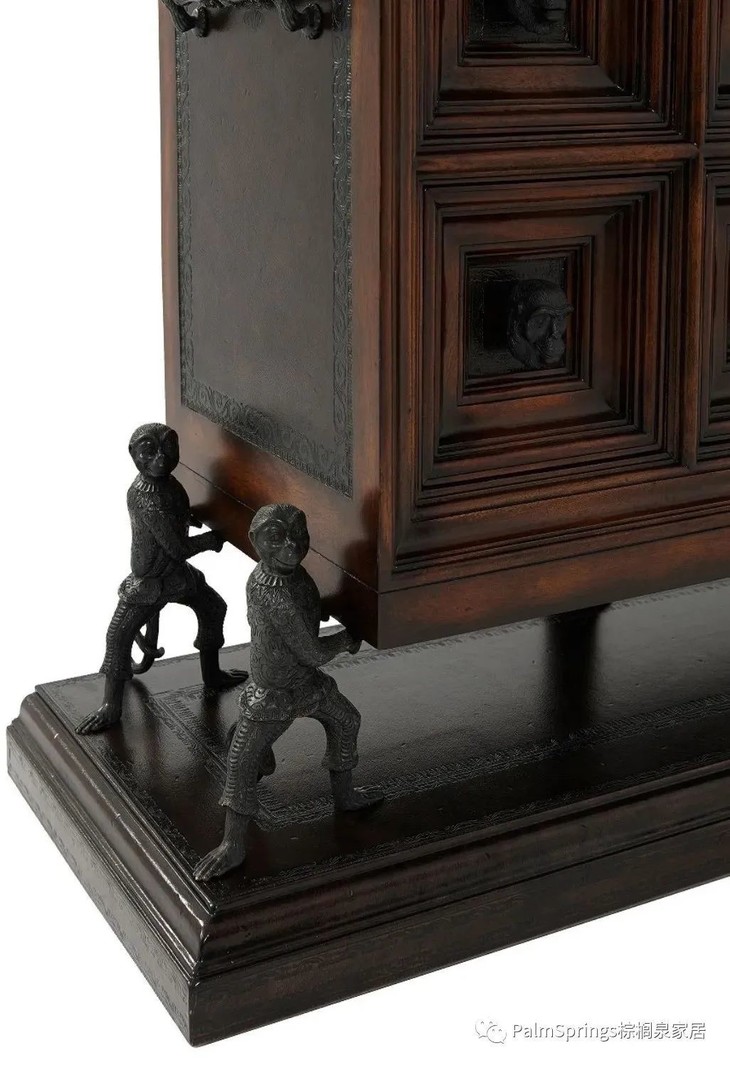 Theodore Alexander也将精湛的雕刻工艺被运用在经典设计中。19世纪意大利风的 幽默猴柜则灵动可爱,四只青铜铸造的小猴子抬着九斗柜,桃花芯木主材,压纹真皮饰面,抽斗拉手亦为青铜铸造的猴头造型,充满了趣味性。