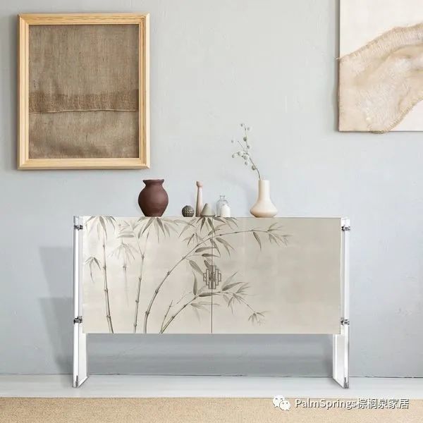 TA墨竹装饰柜则将竹子摇曳多姿,飘逸俊朗的形象和气韵生动呈现,以贴金箔的柜门打底,两侧的亚克力立板的透明属性增强轻盈飘逸感,一改传统中国风家具中常用的黄铜拉手,传统的中式拉手采用了镍铬合金材质,银白色的色调和整体配色搭配和谐,也带来新意,浓淡相映、妙趣横生。Palm Springs棕榈泉家居 - 全球家居精品集合店,销售来自全球80+经典及新锐设计品牌,为大家挑选买得起的设计好物。