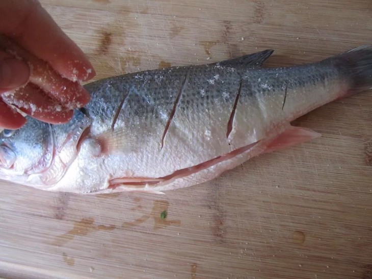 1、在鲈鱼的表面划上几刀,将适量的葱、姜、料酒、胡椒粉、盐混合,均匀的涂抹在两面,腌制半个小时;