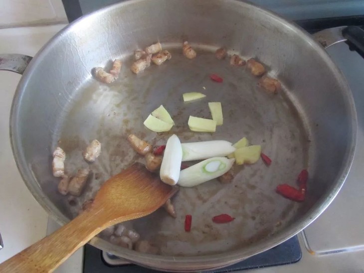 3、锅中留底油,冲姜蒜爆香,放入干辣椒、1勺郫县豆瓣辣酱炒匀(选配五花肉此时放入锅中炒香);