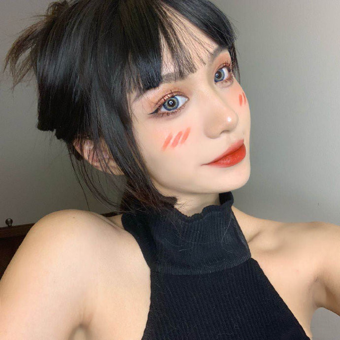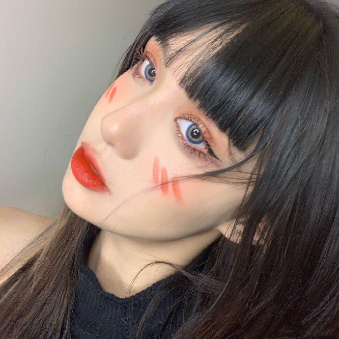 腮红部分微微画三条斜杠,不用沾太多唇釉