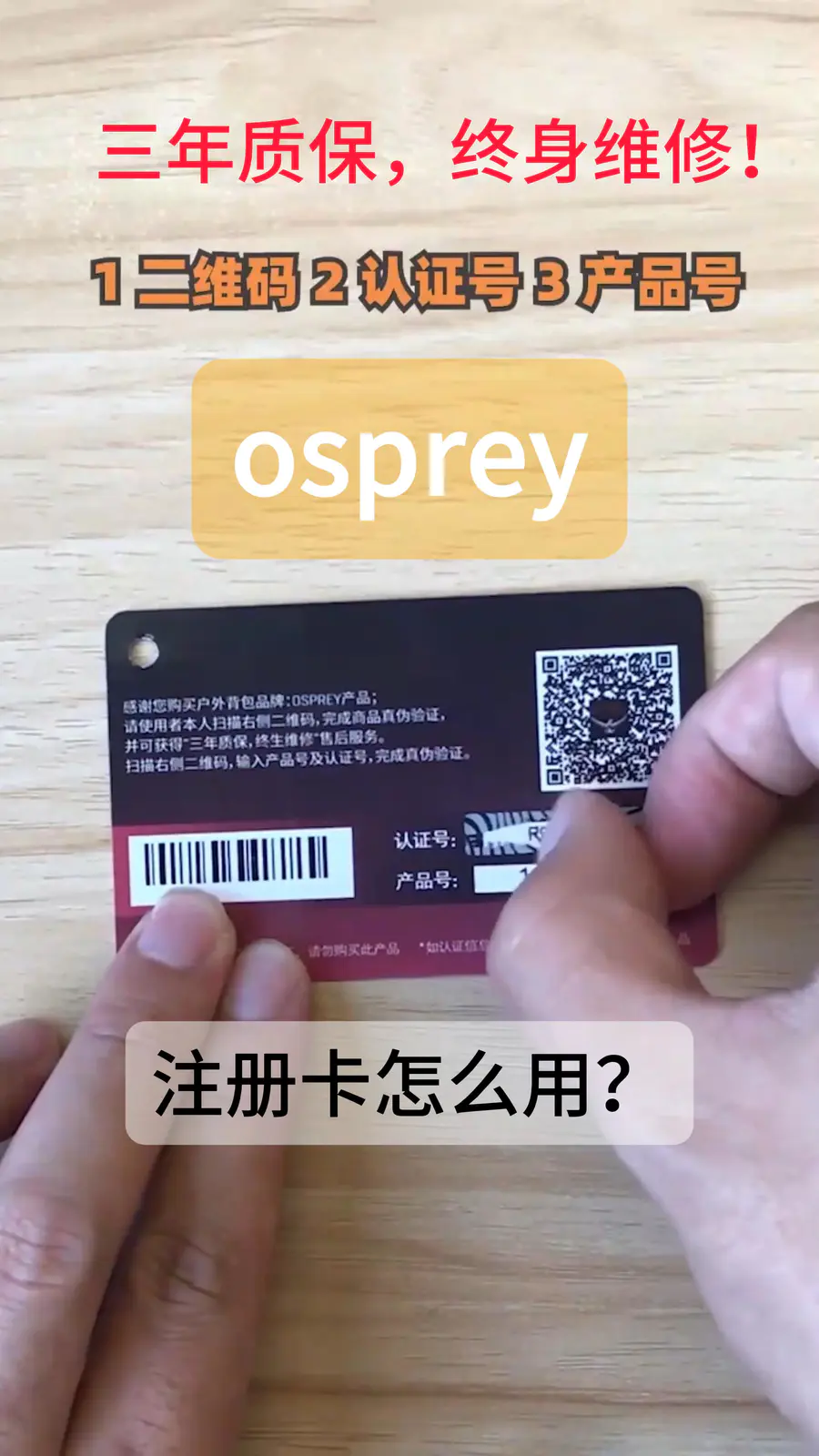 一直有小伙伴遇到注册问题,特此录一个视频教程给大家~~ 点击图片进入视频 本店铺所有osprey背包都带有注册卡,三年质保终身维修,假一赔百!