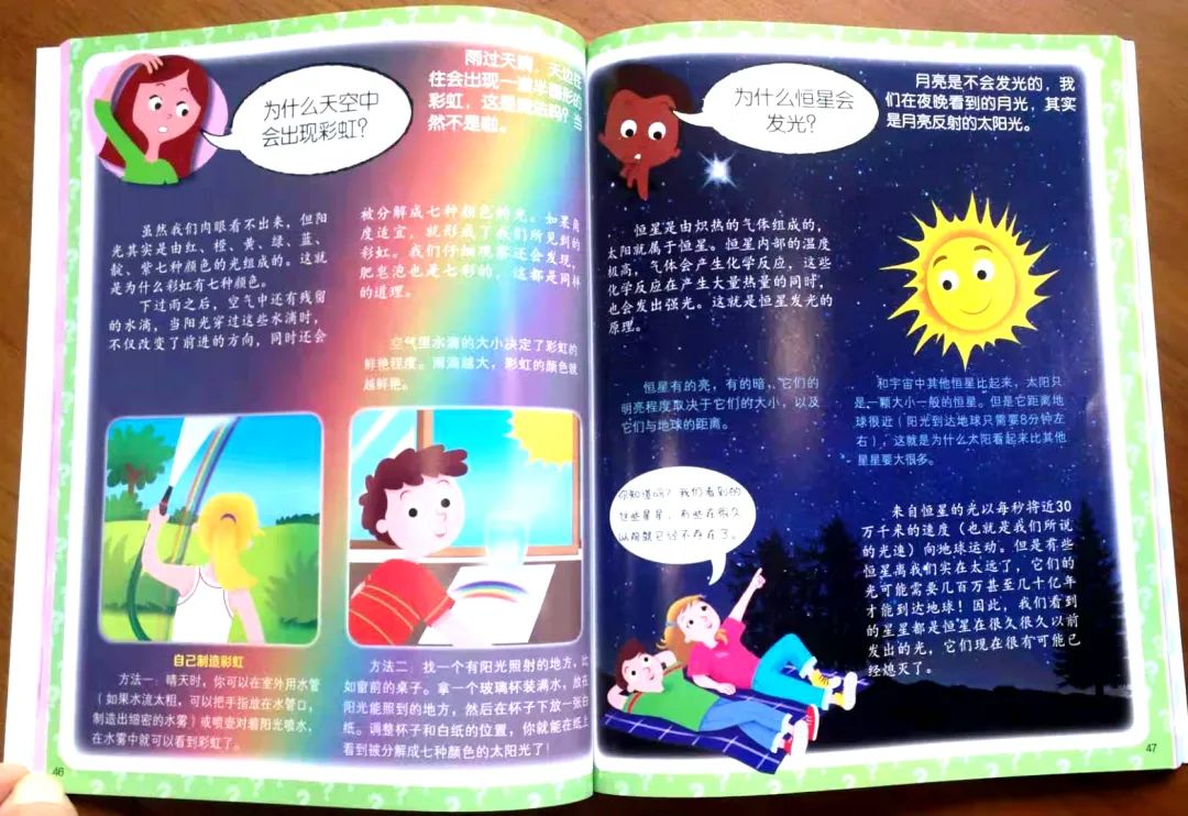 整套书包含3600多个趣闻妙答,以小朋友们最常用的“为什么?怎样做的?什么时间?什么人?多少啊?真的吗?” 提问方式启发,代入感强,接受度高。