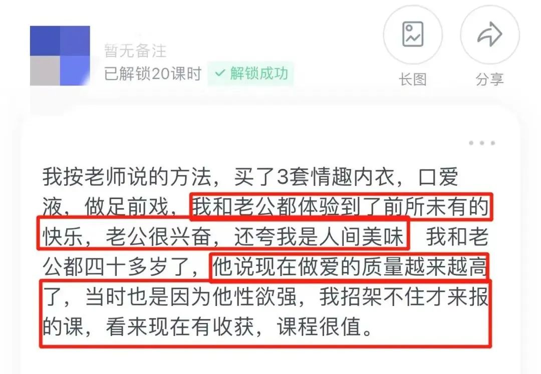 甚至,还有说,“40多岁的夫妻,和老公体验到了前所未有的快乐,老公很兴奋,夸我是人间美味,课程很值!”