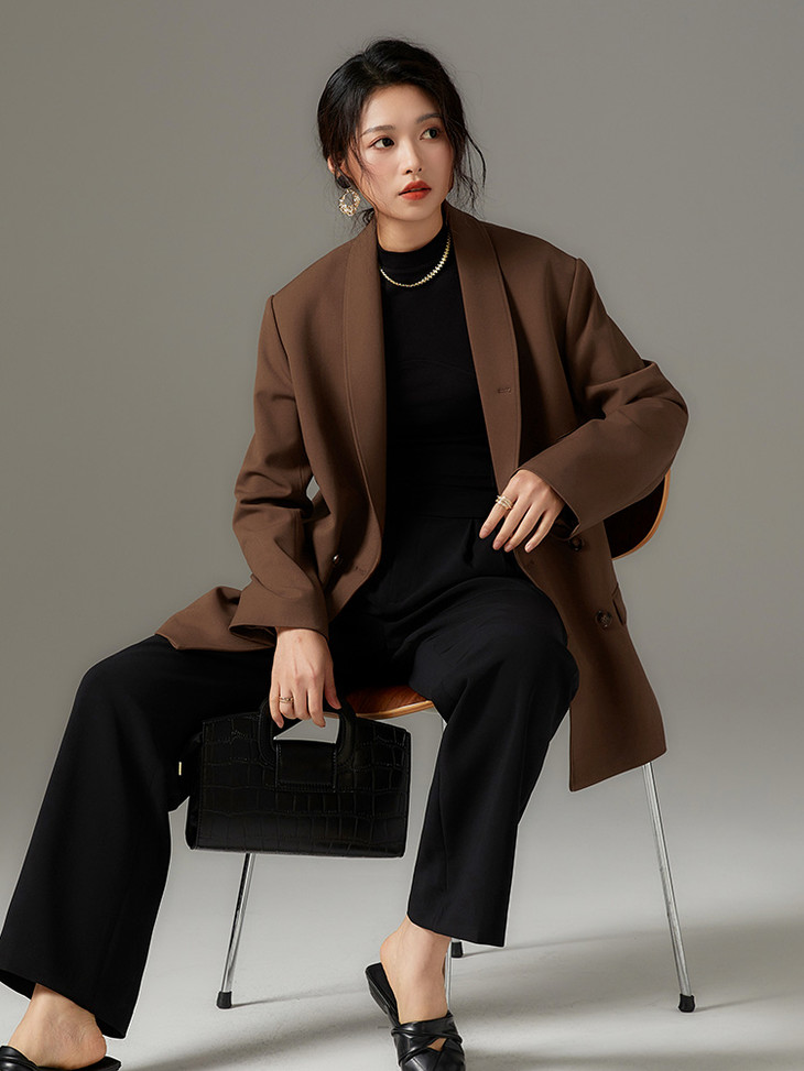 经典深咖西装,青果领优雅修颈,双排扣精致添韵。