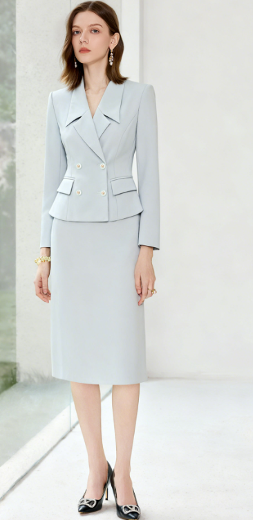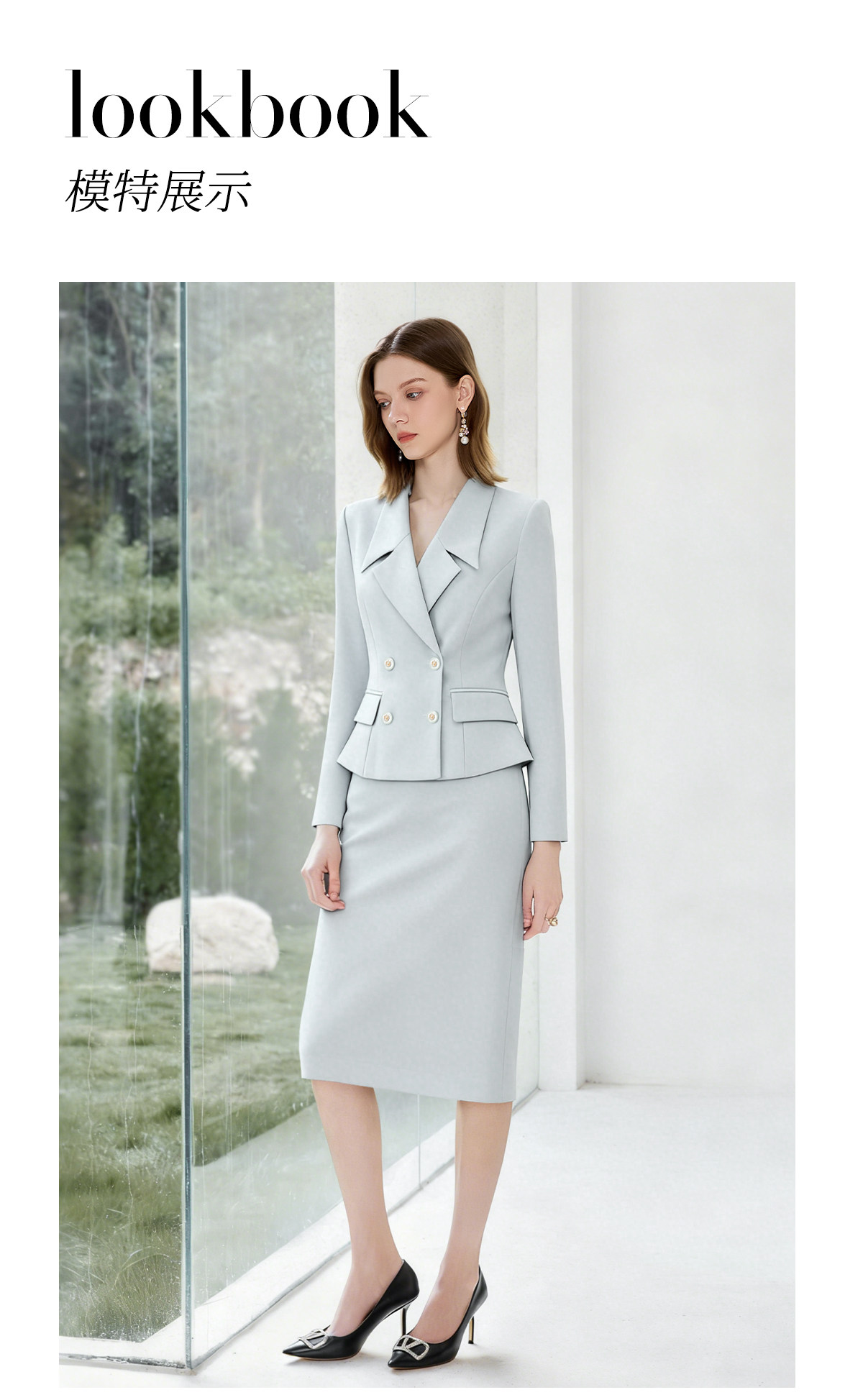 把春日的晴空穿在身上,就是这套雾霾蓝西装套裙的魔力。低饱和度的浅蓝自带温柔滤镜,一扫深色西装的压迫感,让你在通勤路上也能拥有松弛的好心情。