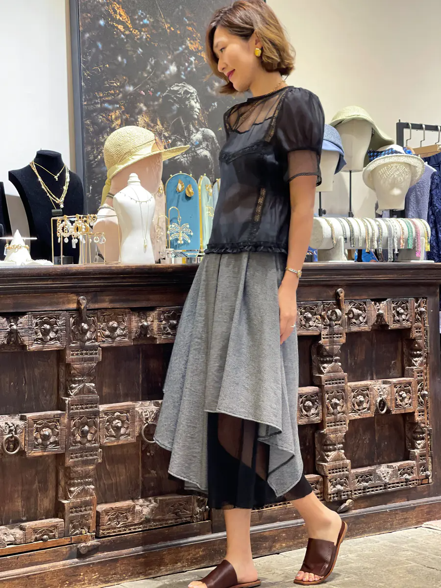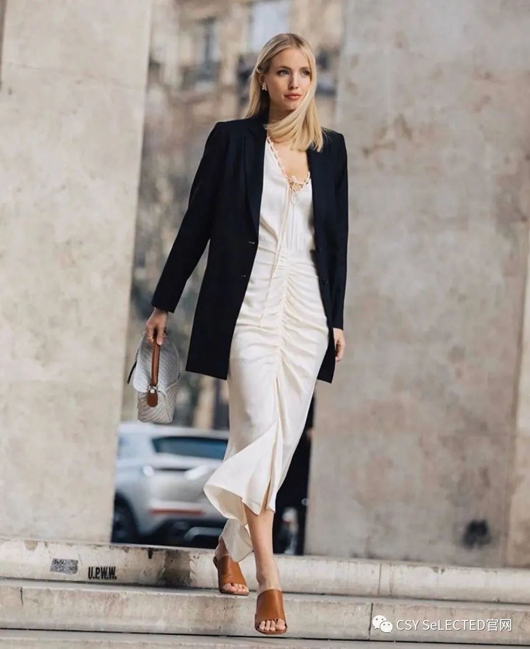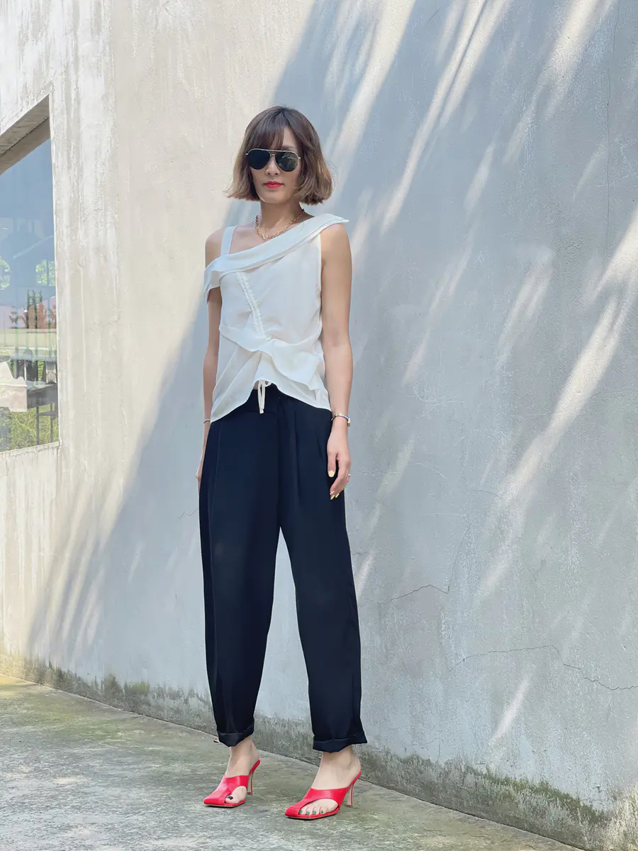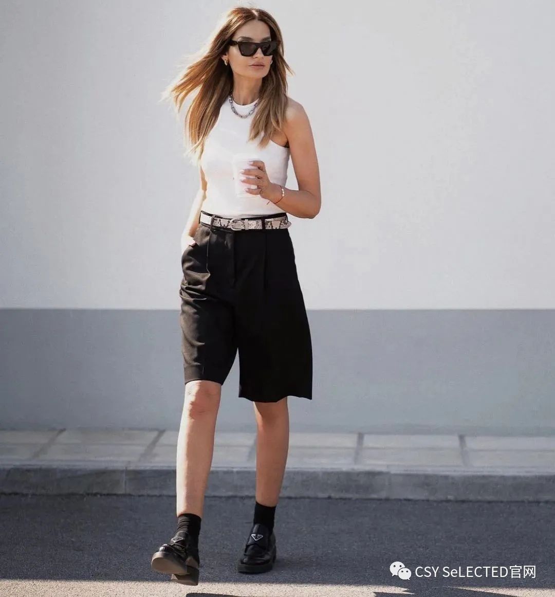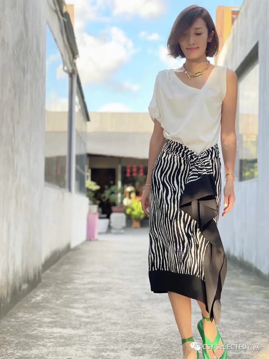 在穿搭这儿,我们可以把皮肤理解为层次。露出的肌肤可以被看作一个独立的色块,可以化解黑白拼色的单调乏味。
