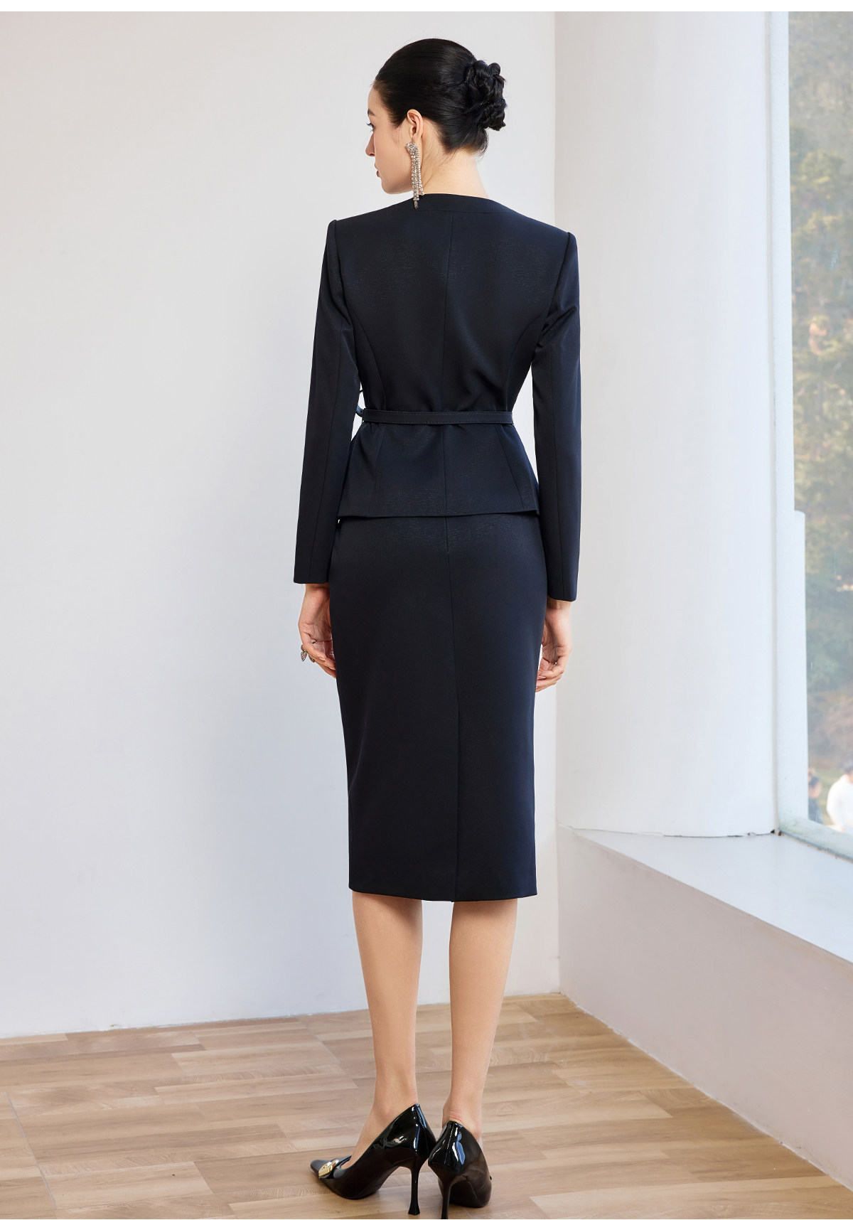 无论是清晨的晨会,还是午后的客户洽谈,它都能完美适配。深色的面料沉稳大气,自带一种不容置疑的权威感,让你在专业领域里,始终保持着自己的独立与锋芒。