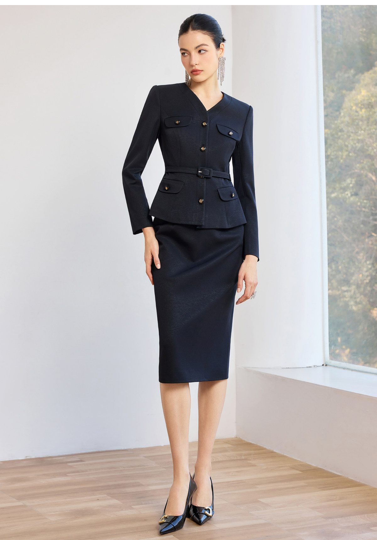 它的魅力在于恰到好处的平衡。收腰的设计巧妙地勾勒出腰线,既不会显得过于刻板,又能在举手投足间流露出女性的柔美与力量。V 领的剪裁,更是在不经意间拉长了颈部线条,增添了几分干练与精致。