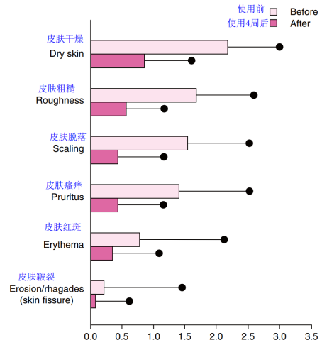 有一项对483名需要辅助皮肤护理的患者进行了研究,这483名中大多数有特应性皮炎(41.8%),鱼鳞病(19.7%),牛皮癣(9.3%),或接触性皮炎 (9.3%)等。在使用含3%泛醇的配方后,所有症状在3到4周后均有明显改善。改善程度达到80%,皮肤干燥和脱屑的改善高达90%。