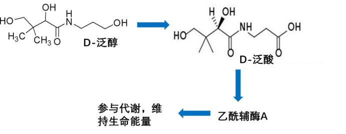 泛醇之所以如此优秀,主要是靠进入皮肤中快速转变成的D-泛酸。D-泛酸这个家伙是乙酰辅酶A的必须组成成分(真是抱得好大腿),而乙酰辅酶A又是参与代谢,维持生命能量不可或缺的一部分。