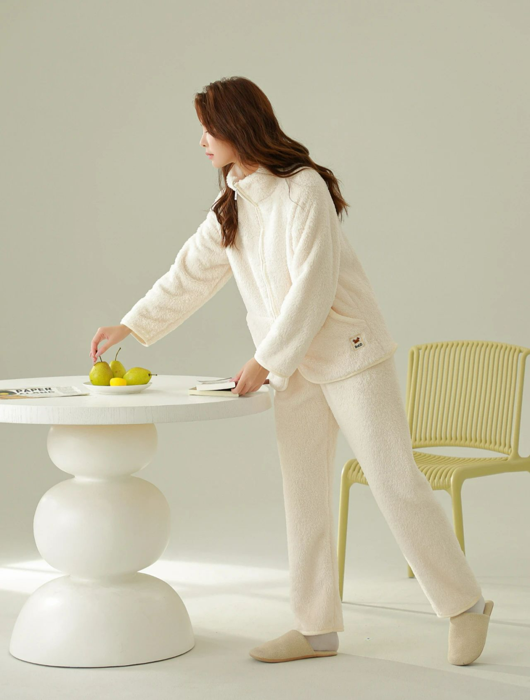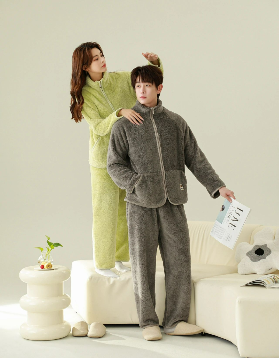 版型上,设计师也做了多方面的调整,上下分体设计,青春又靓丽。且不论男女款,上衣和裤子都是同种颜色,风格更和谐统一,穿着有范儿~大开翻领的V领领口,不光让每个穿上的人,都显脸小一圈~版型宽松又利落,加上珊瑚绒的面料不像羊羔绒那么显臃肿,上身不会显胖~