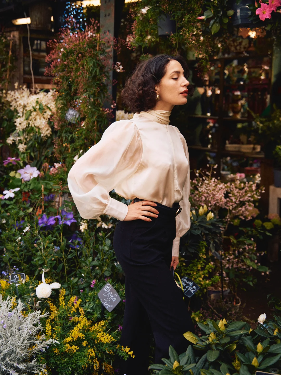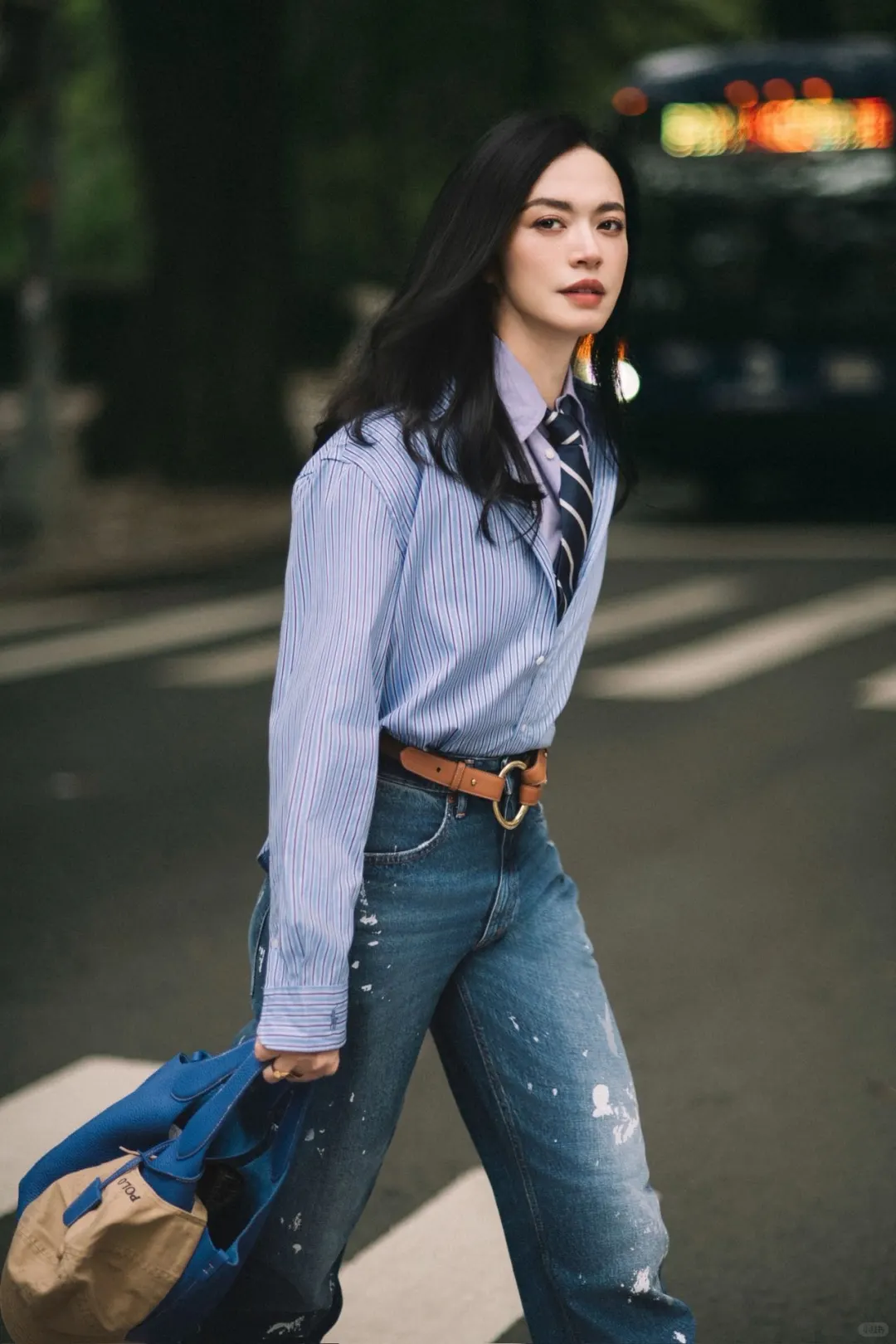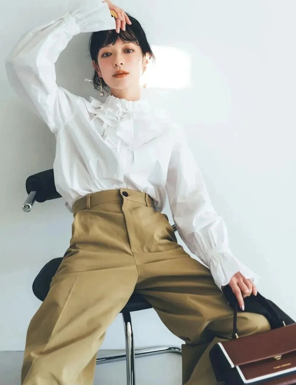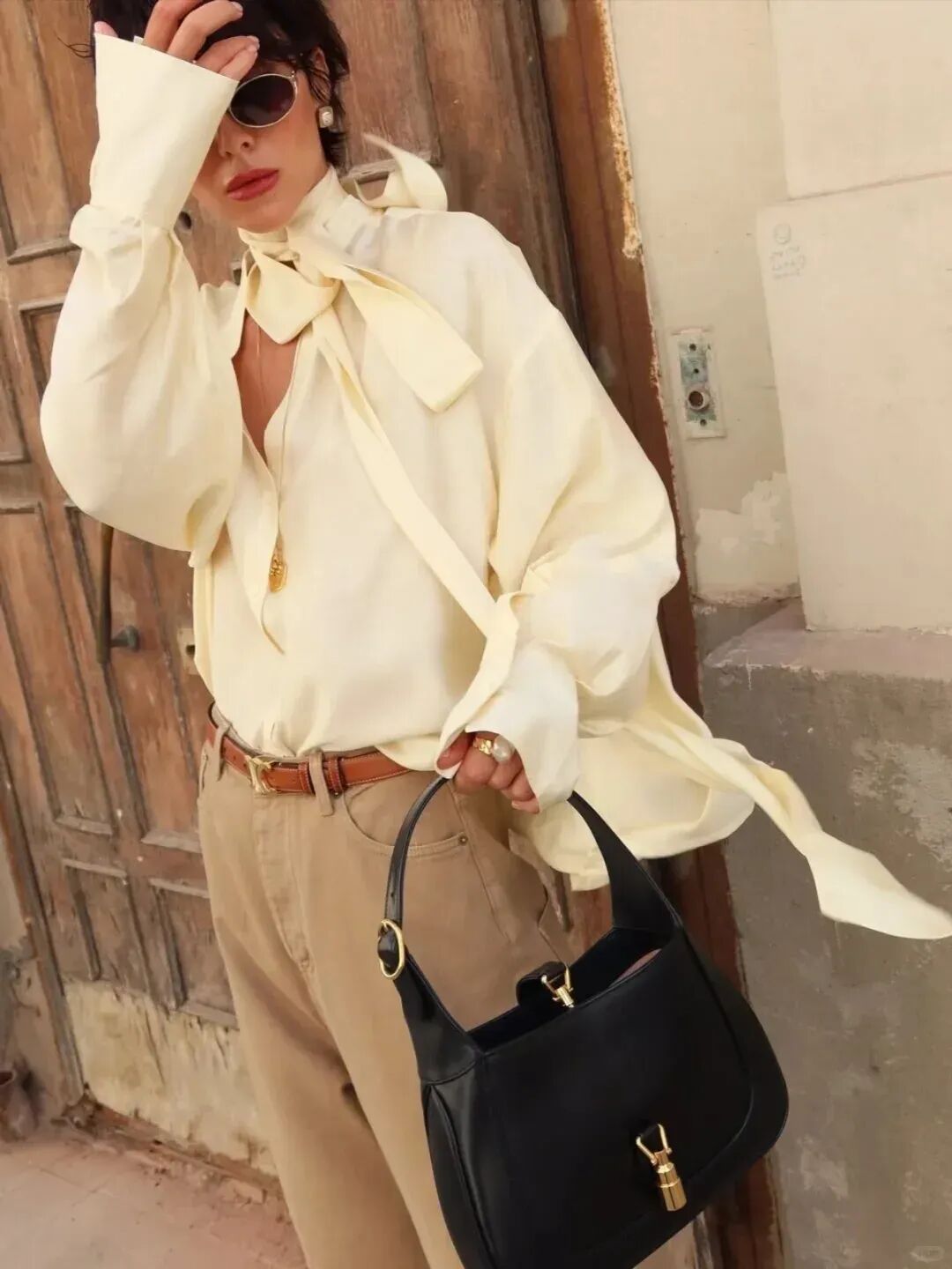 真丝或雪纺材质的飘带衬衫更轻盈飘逸,
