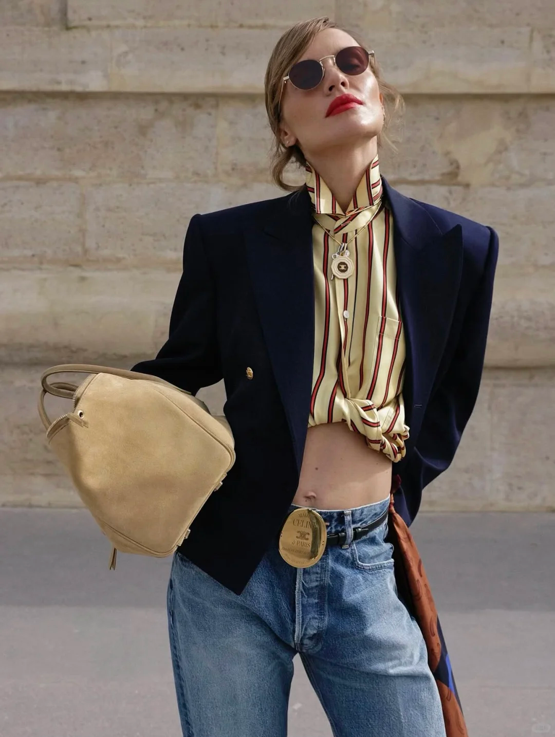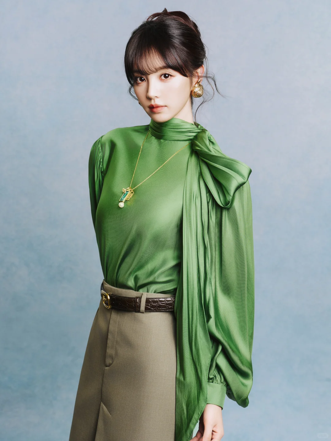也可尝试彩色飘带衬衫,如蓝色或绿色,
