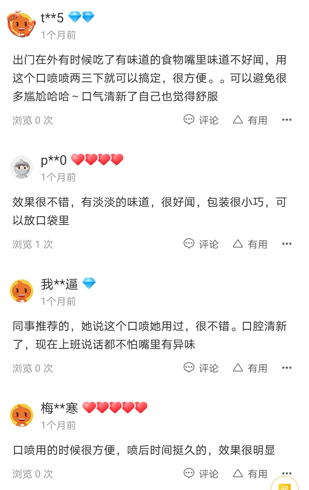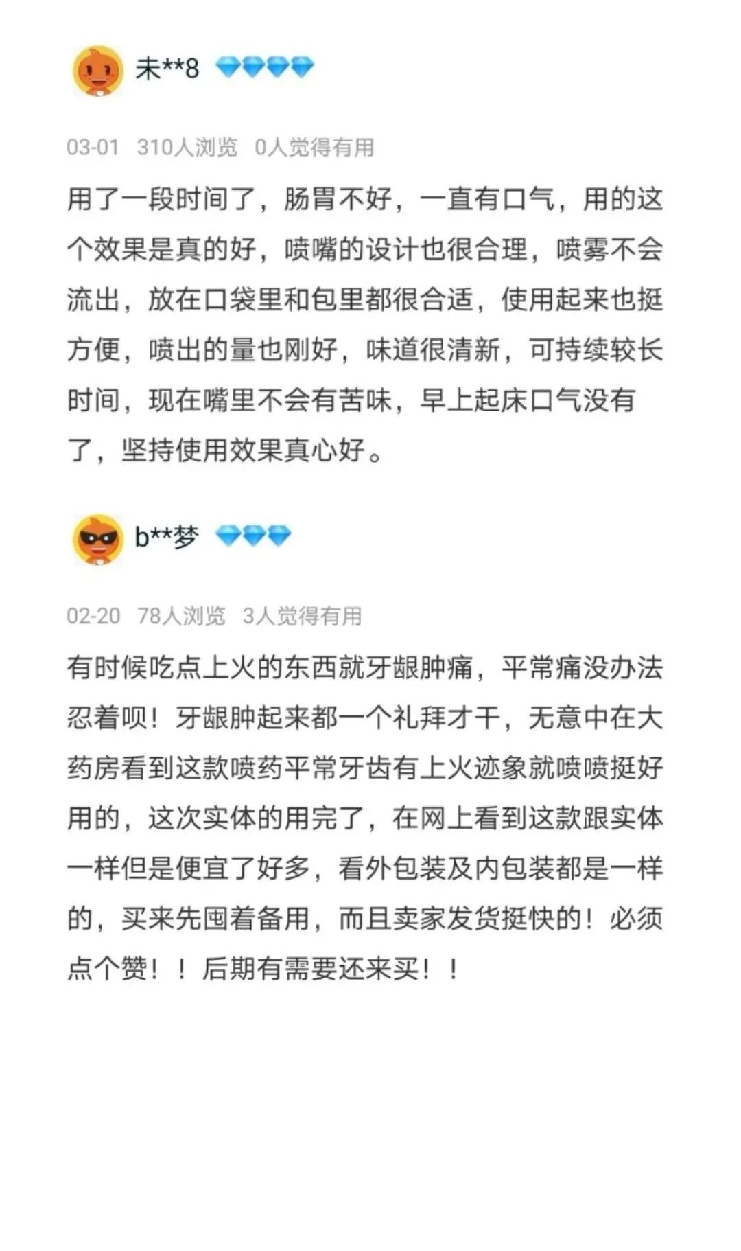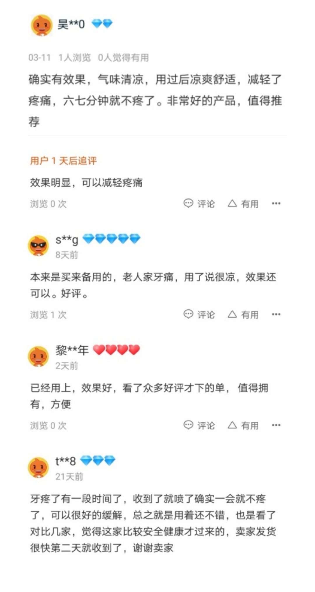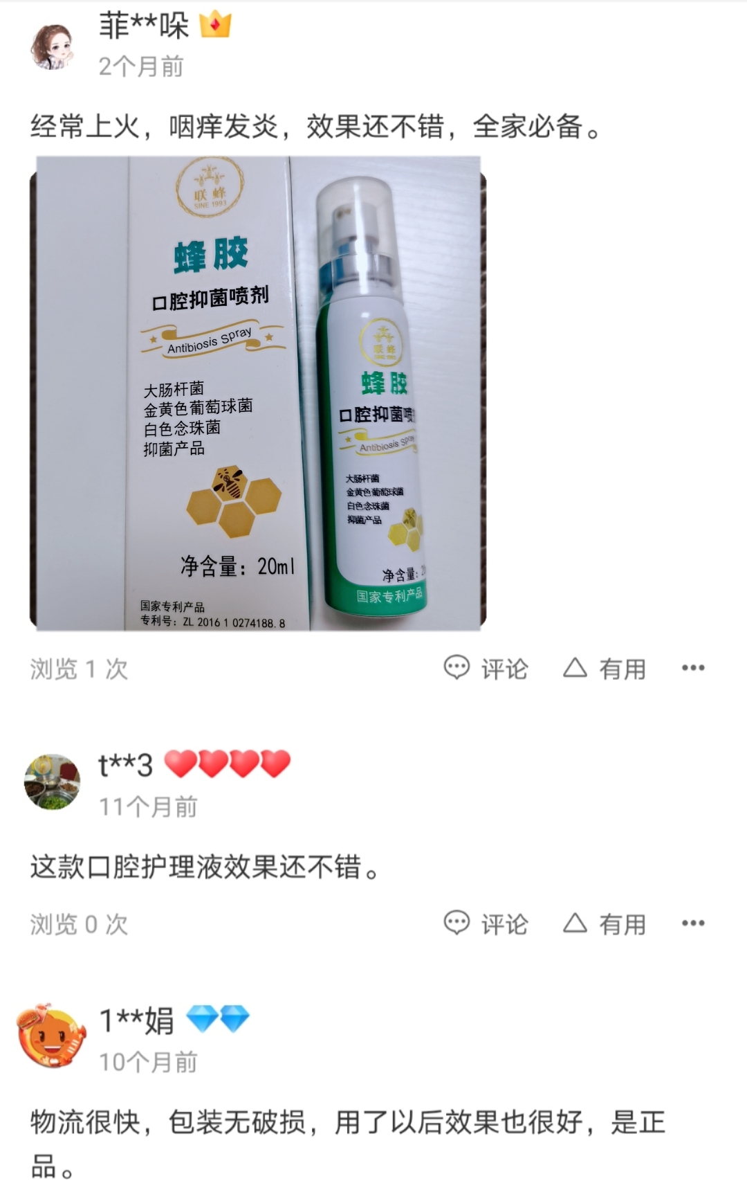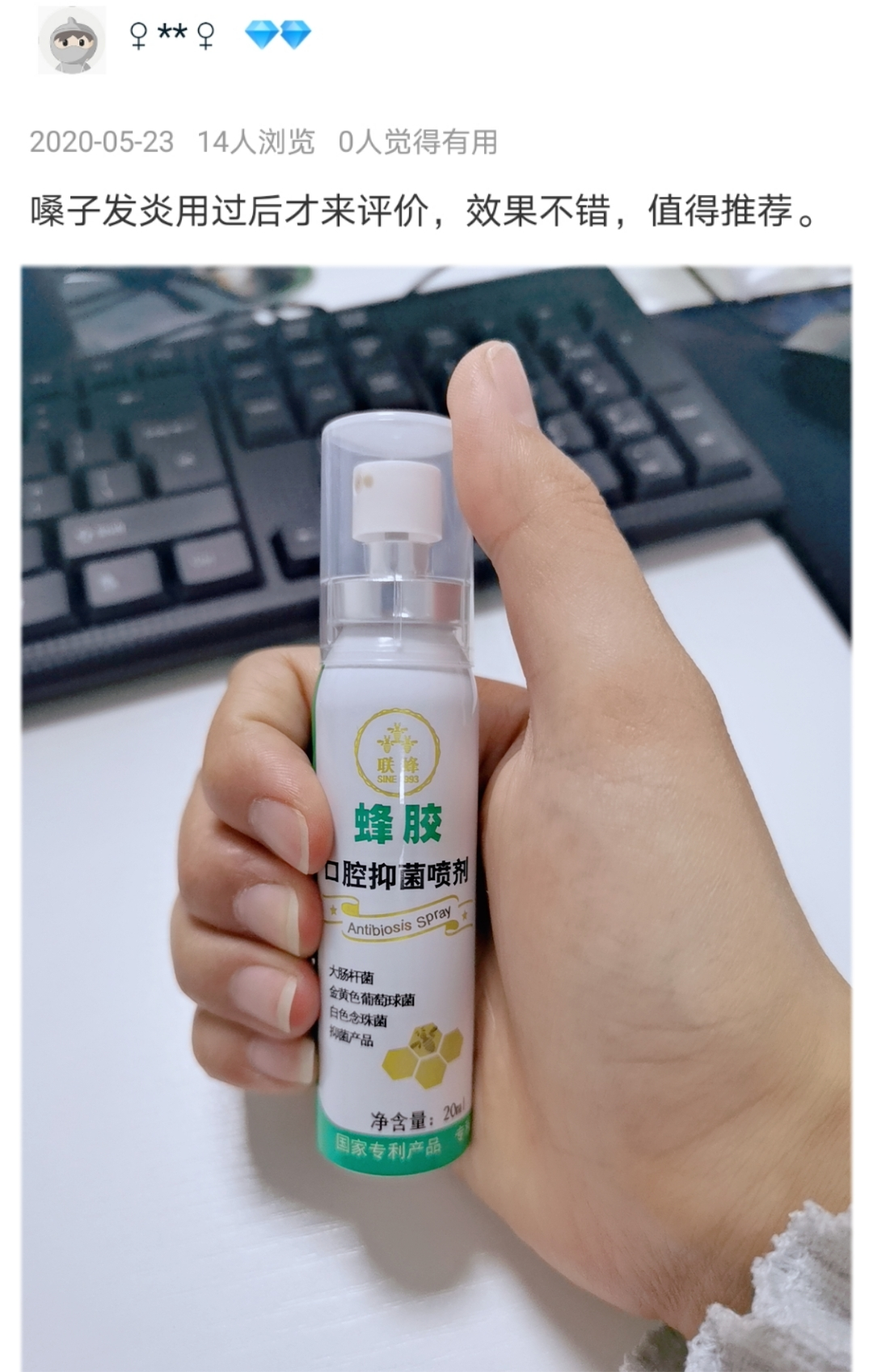 经常性口腔溃疡,每次去药店都要几大包药,连着喝好久才会好,这个产品感觉使用比较方便,就试了试,没想到第一天喷完不到5秒就不疼了,隔了4个小时吃饭疼痛的感觉已经消失了,太神奇了,伤口愈合好快!见效好快,价格也不贵!支持!