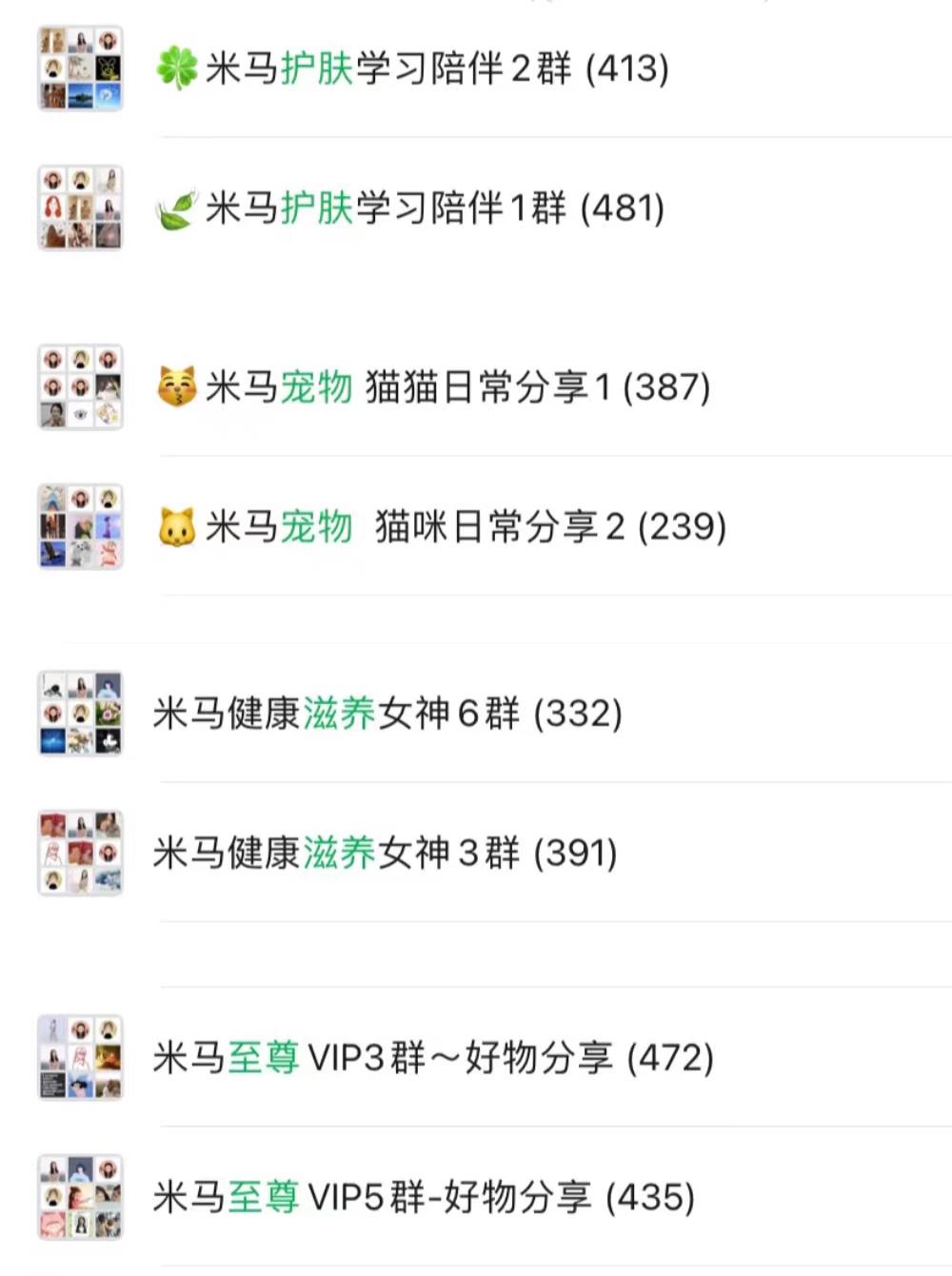 这几年我们积累了好几万的微信好友、几十个不同类型的社群(有至尊群、养生群、护肤群、宠物群等等),很感谢这么多同学一直信任并喜欢 “米马” 平台。