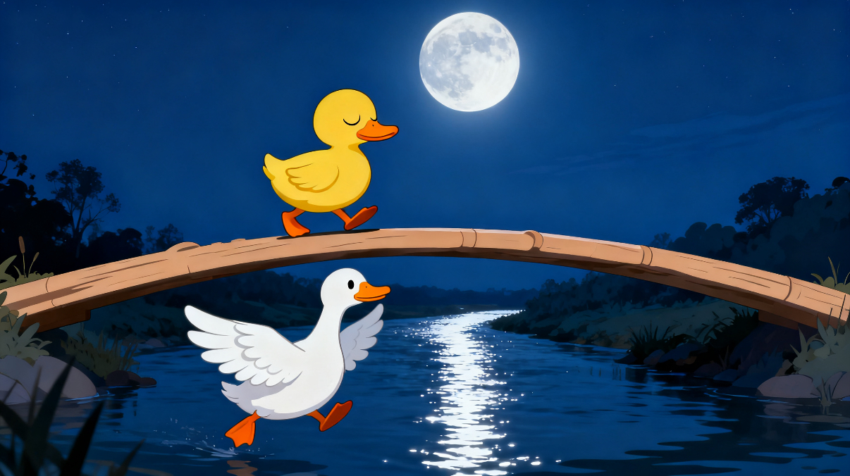 就看到小黄鸭摇摇摆摆地走上一座独木桥。