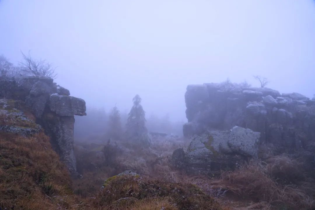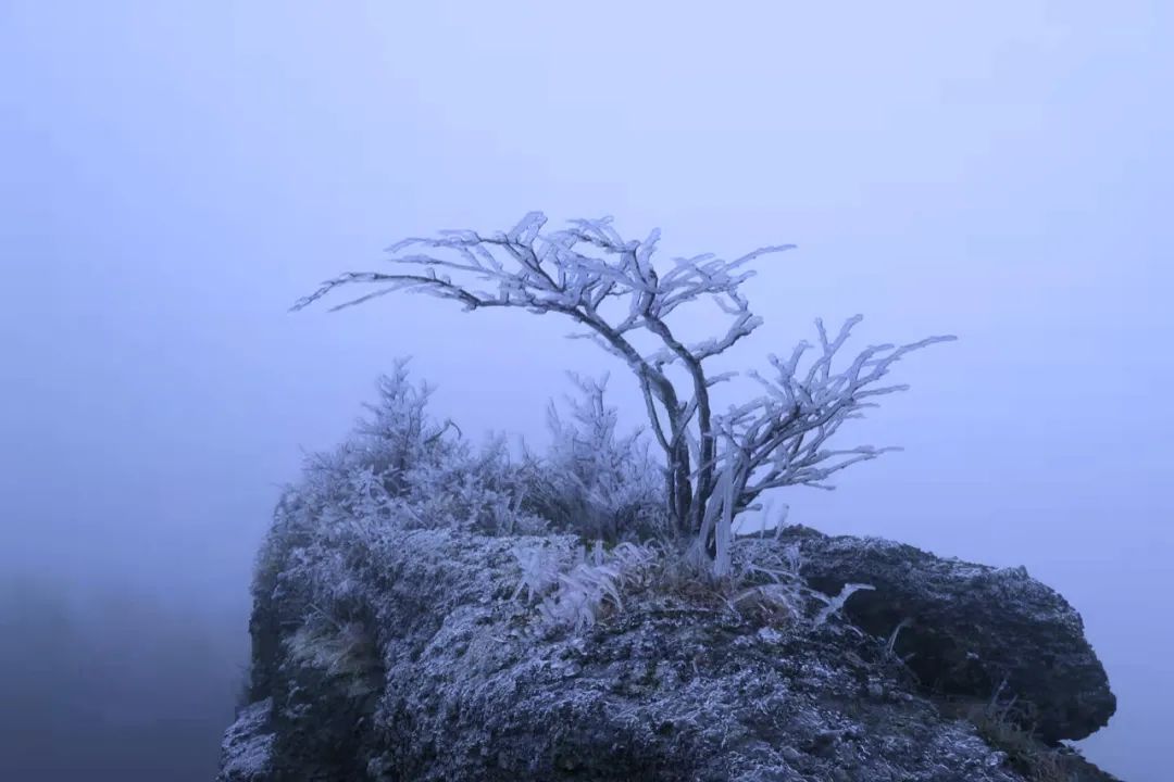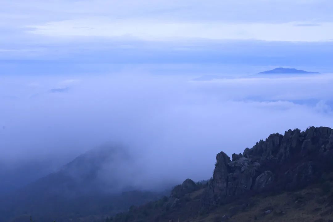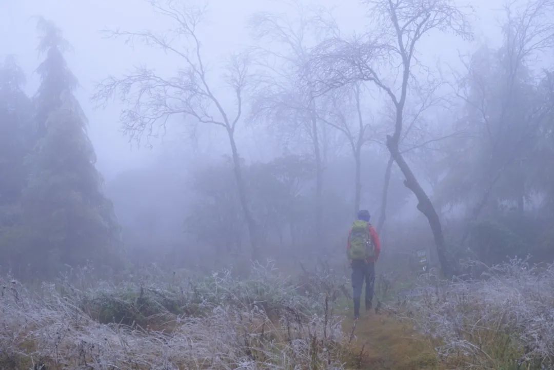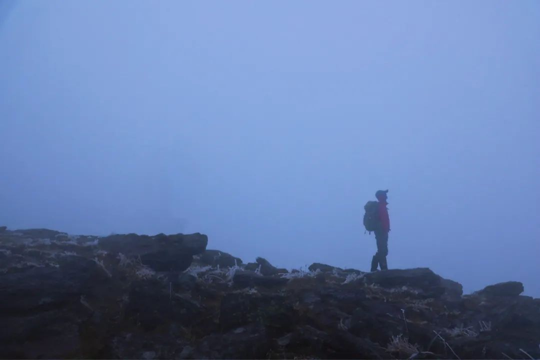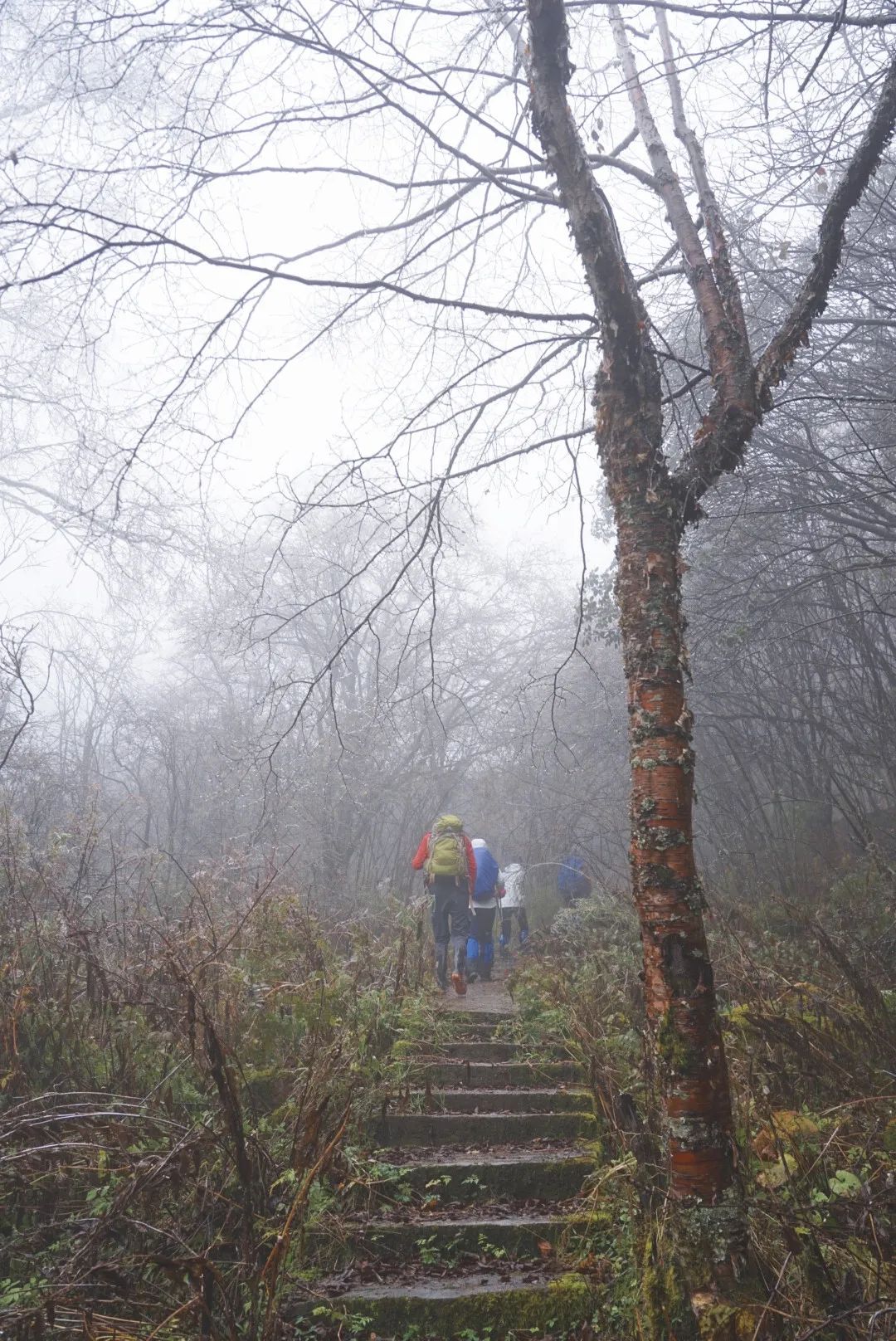 半山腰上有一片怪石,在山下(小木屋那里)看宛如长城,被山民戏称“城墙”。(因为雾大看不清,没拍到山下远景)再往上走,完全是另一番景象,恍惚间像是走入一片莽莽雪原。远看前面的队员,不禁感受到人在自然面前显得如此渺小。
