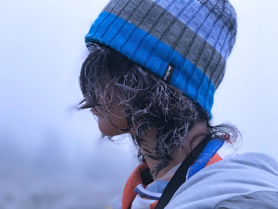 下山的时候,我的头发也变成了冰挂。不知道是这防水冷帽过于给力,还是沉迷美景无心其它,我一点也不觉得冷。直到小万拍下这张照片,我才知道自己头发结了冰。
