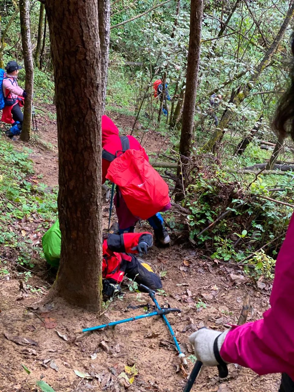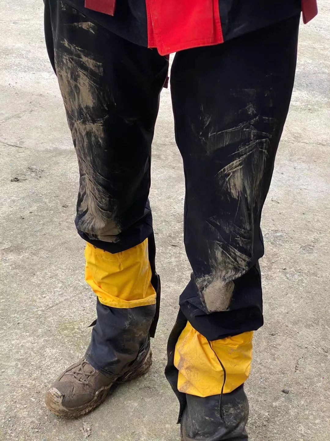 呵!老天爷教训的就是我这种不听话的毛孩子。这一天摔的最惨的就是我了,没有之一。本来是用于防滑设计的大凹槽鞋底,在这种路上卡住厚厚的泥,变得更滑了,抱着树都不能阻止我“纵享丝滑”的摔倒,后来直接自我调侃,每每到陡坡处就让队员准备好手机,好在路面只是有泥,没啥危险,就当滑滑梯了。