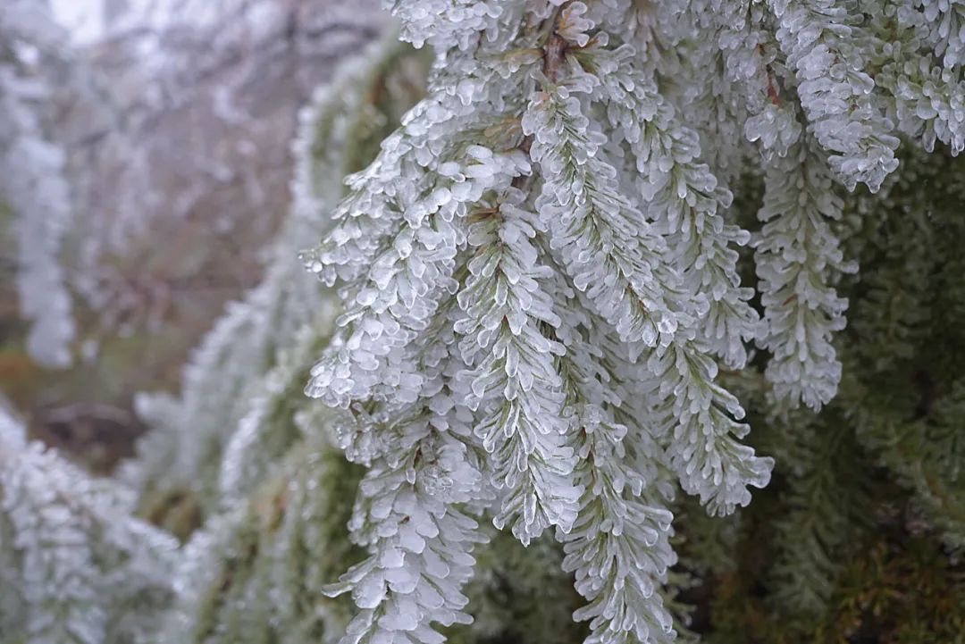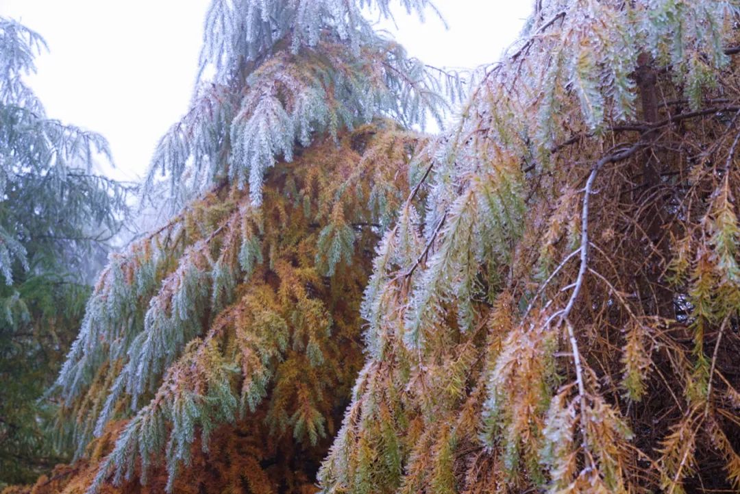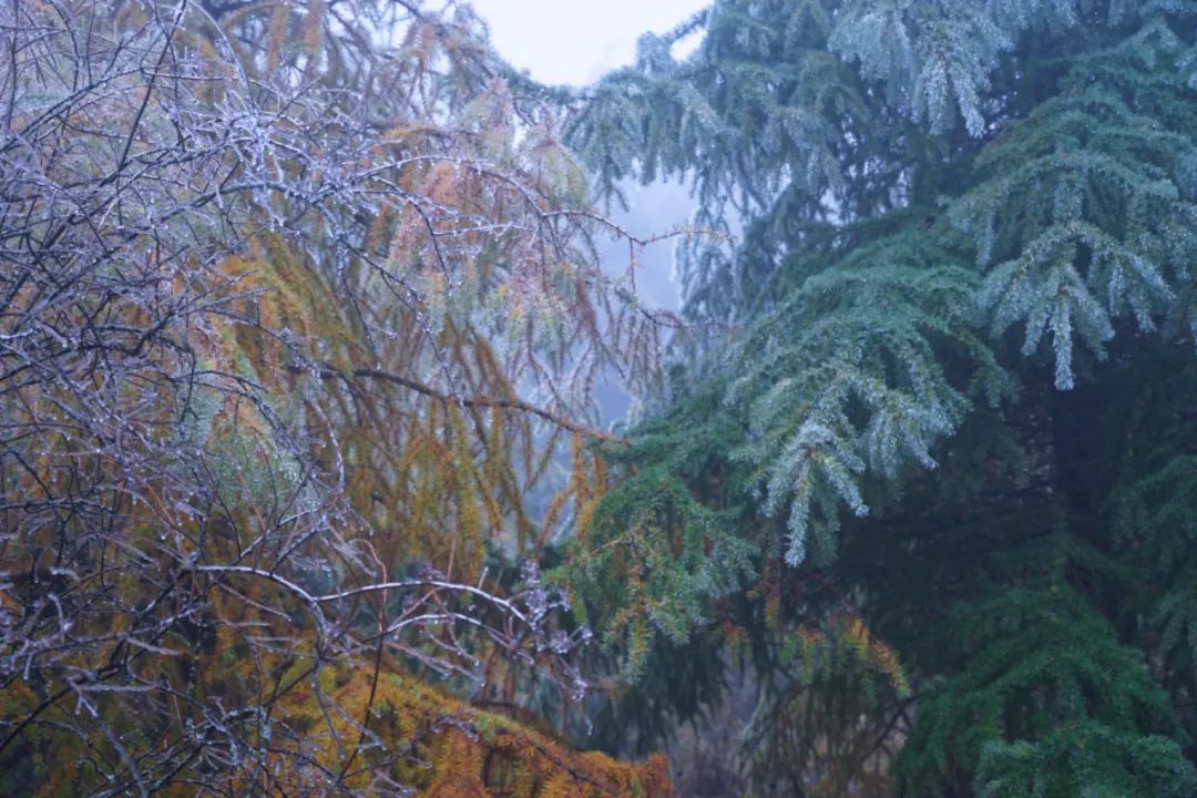 10 月中旬,神农架还未到深秋,落叶松处于由绿变黄的过渡时期。降温来得突然,冻住了这一场过渡,青黄渐变的冰挂,让我频频停下脚步,忍不住拍照,连当地向导都说这景致难得一见。