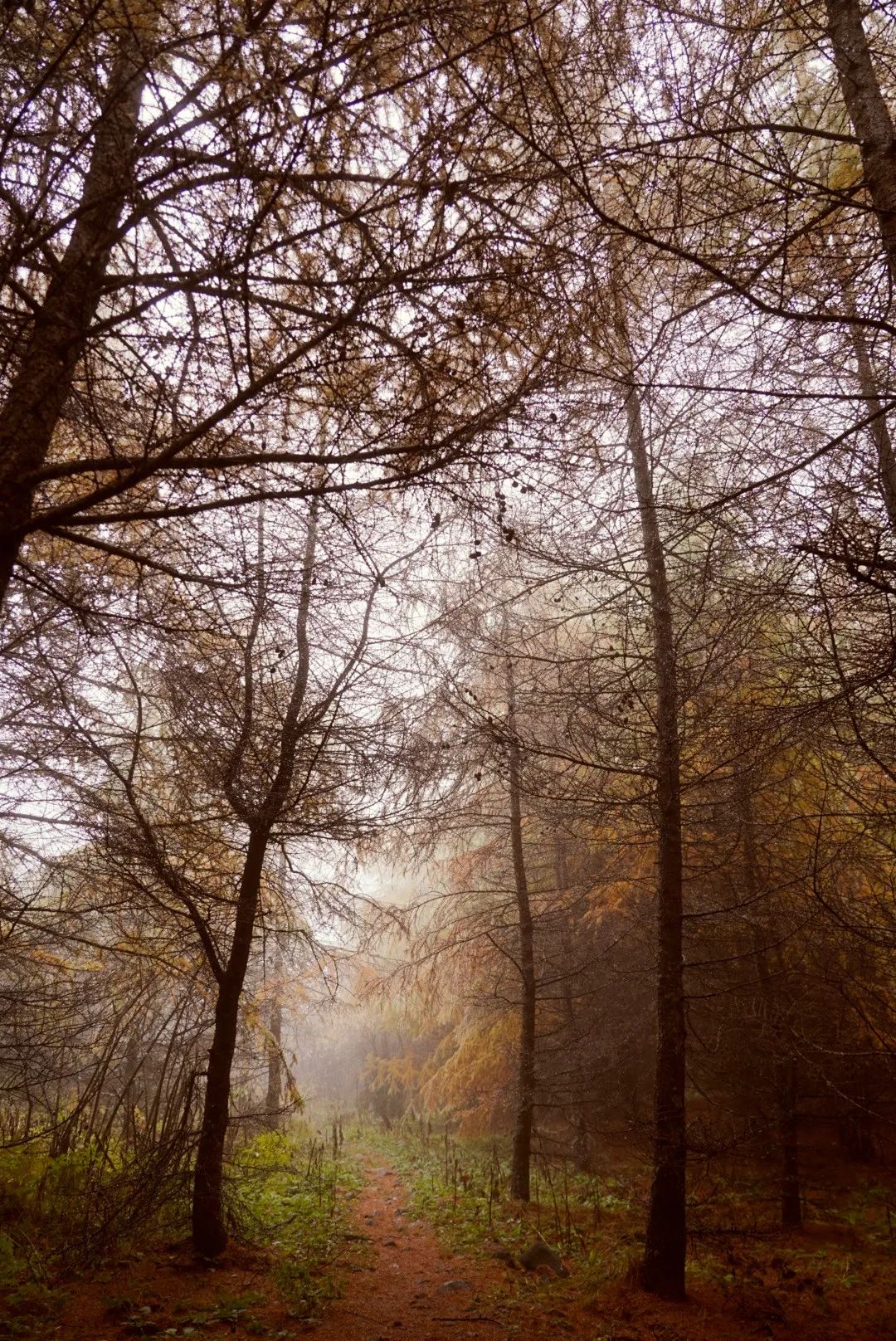泥泞小路的出现,似乎在提醒我们已经进入森林深处,不时需要弯腰穿过低矮的树枝。前方景色逐渐丰富起来,因为——落叶松出现了。