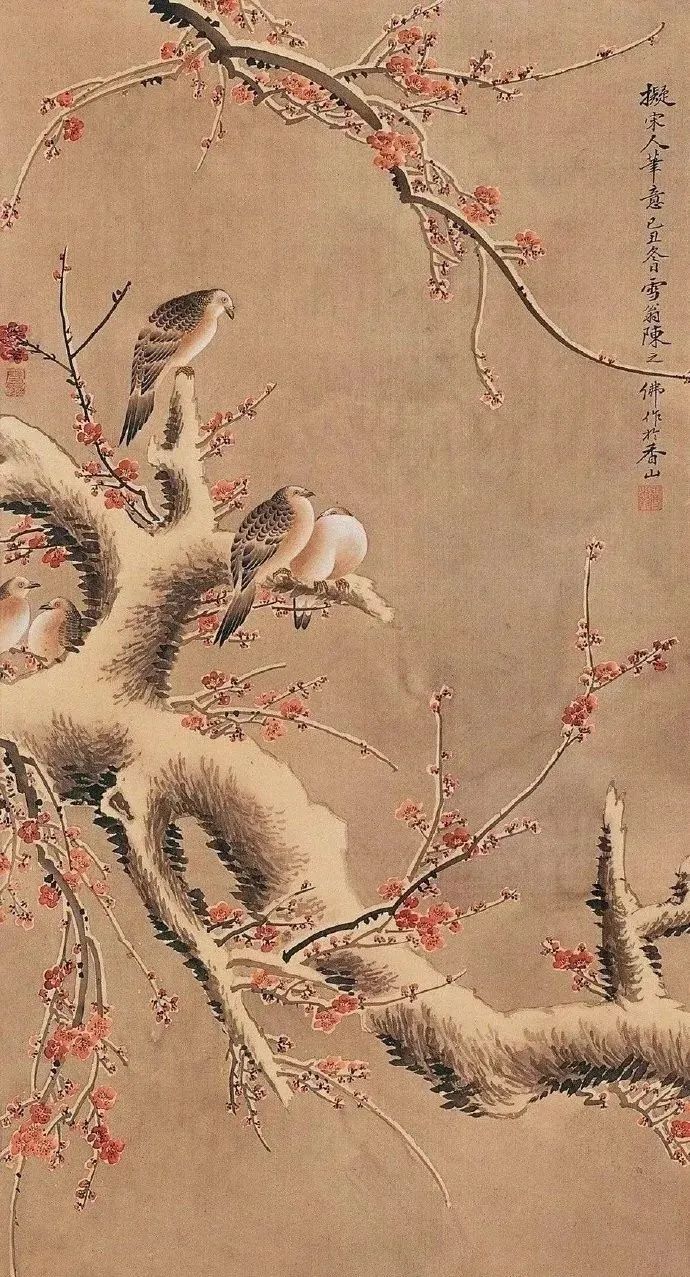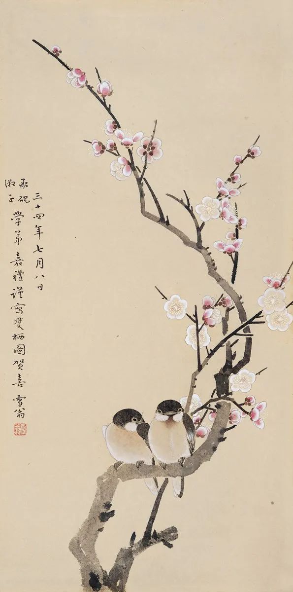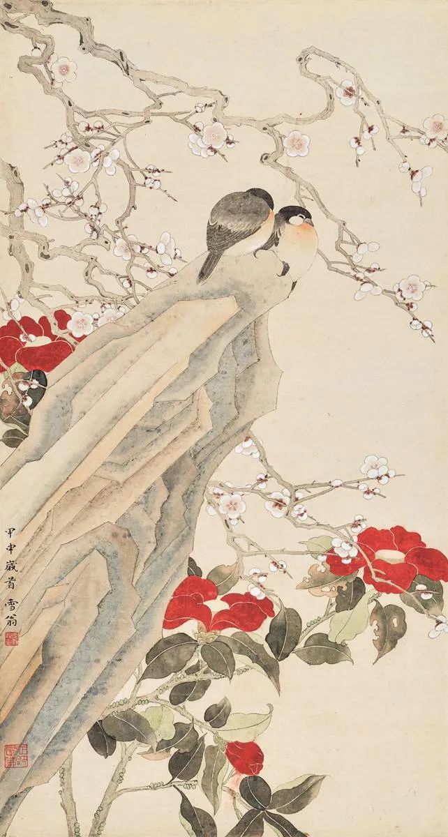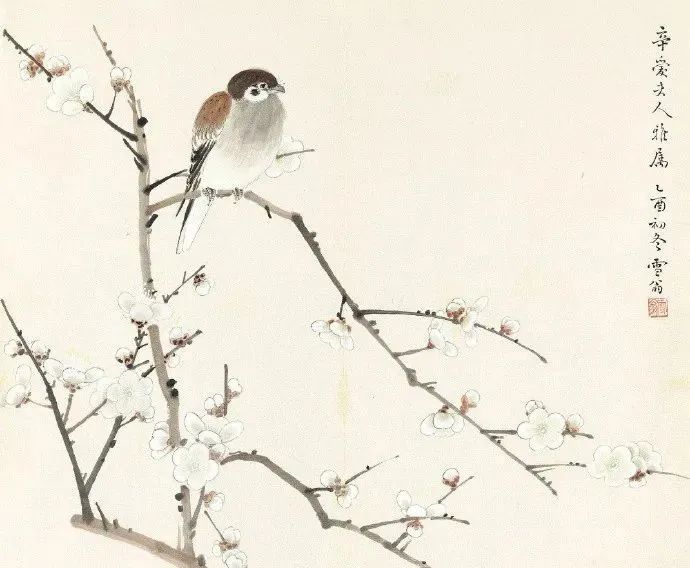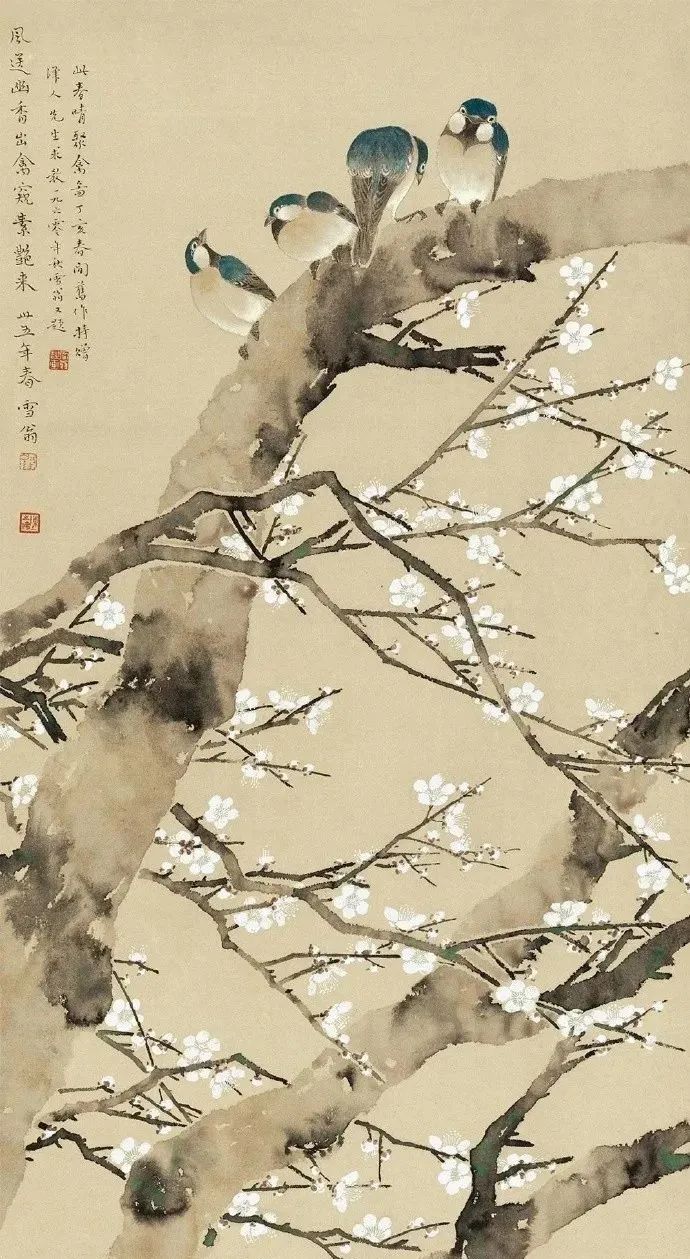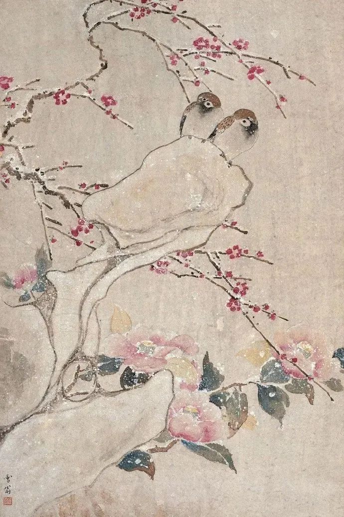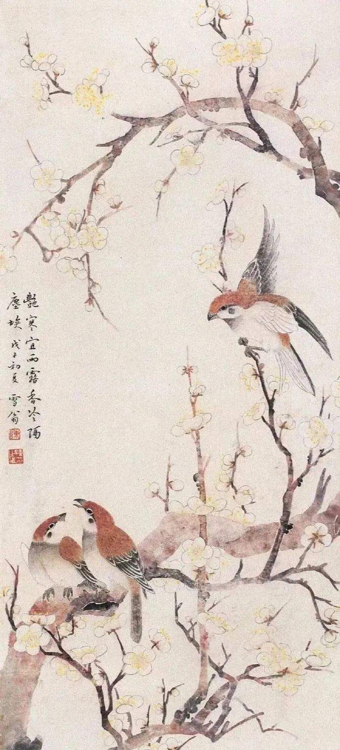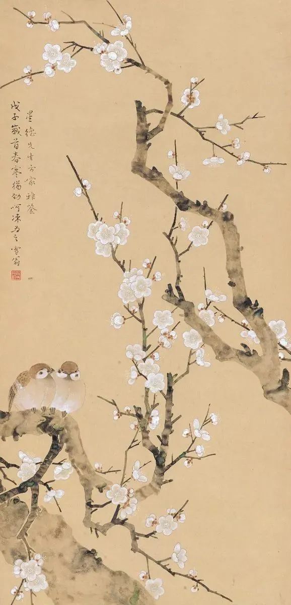 他笔下的梅花,常常配有数只鸟雀,构图别有意趣,用笔刚健细腻,古雅有致,设色艳而不俗、淡而有味,清净的画面中总流露出精致秀逸、淡雅明丽的古典气质。