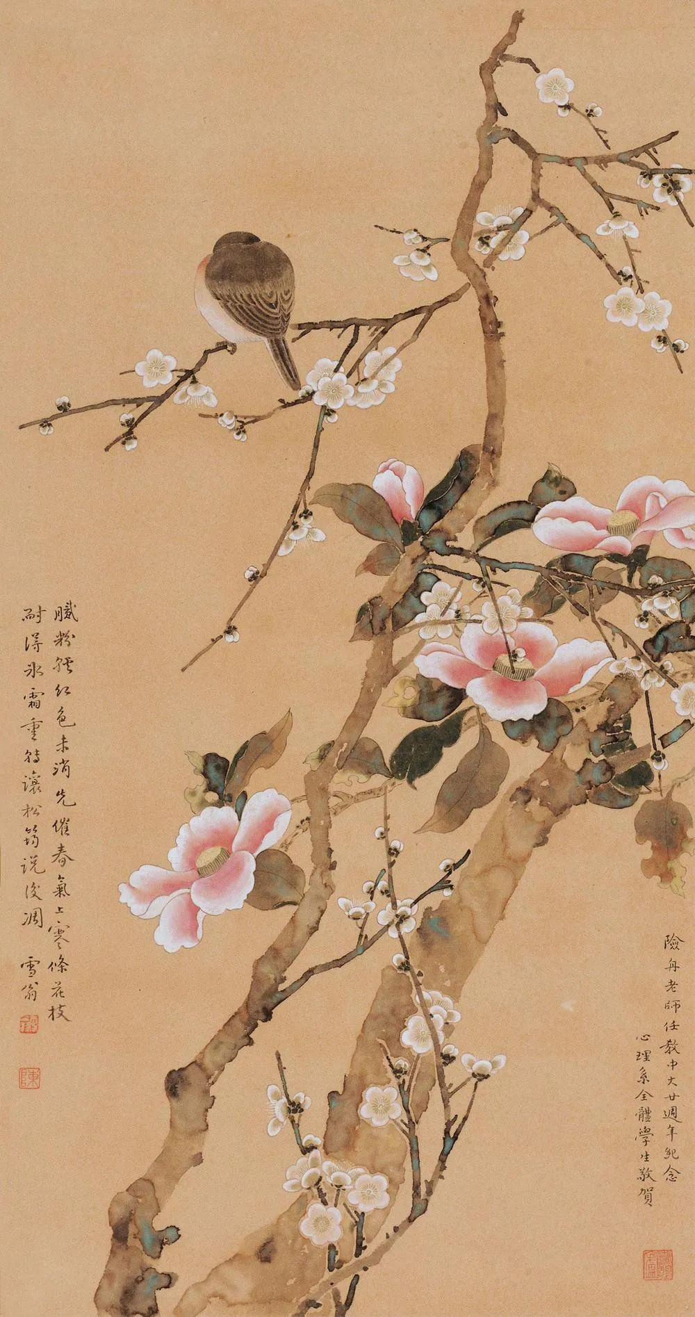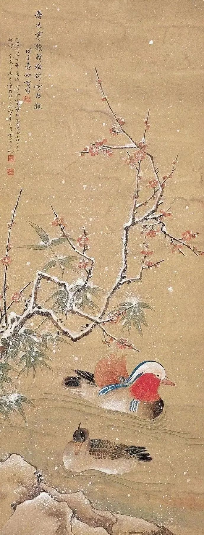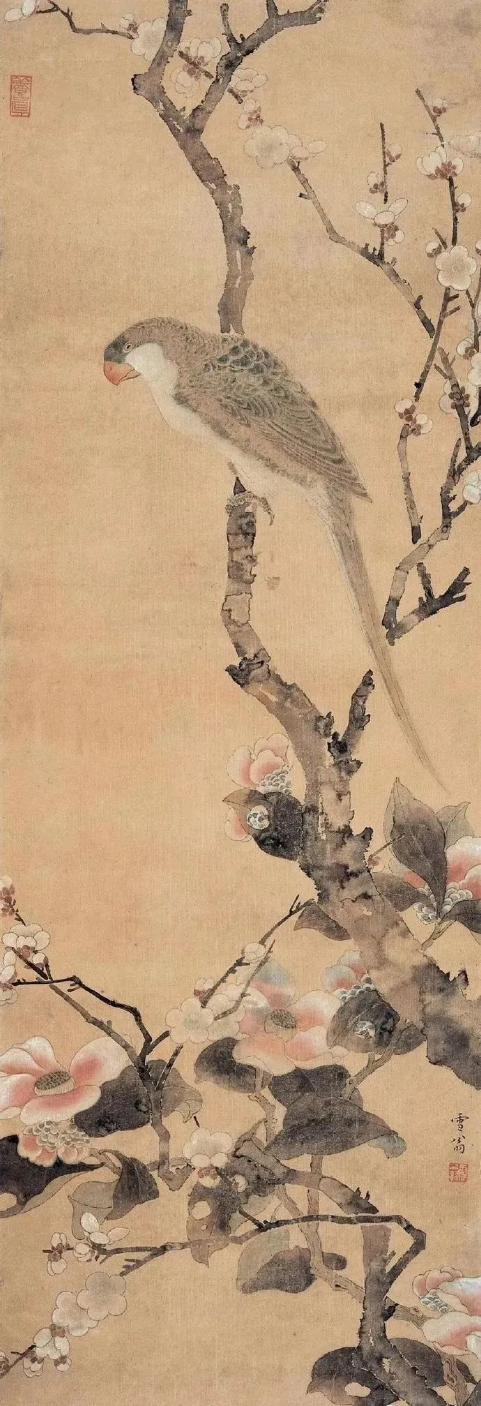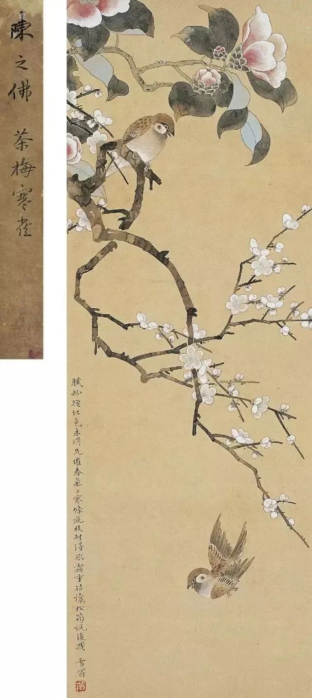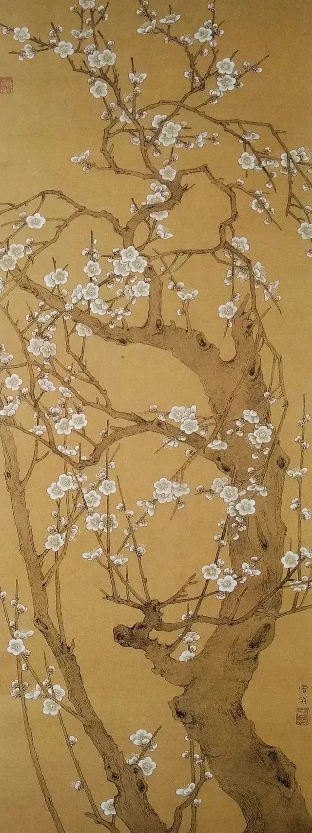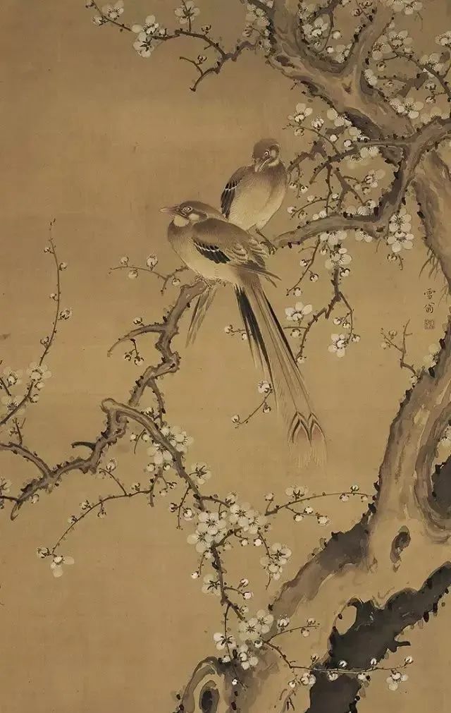 他笔下的梅花,常常配有数只鸟雀,构图别有意趣,用笔刚健细腻,古雅有致,设色艳而不俗、淡而有味,清净的画面中总流露出精致秀逸、淡雅明丽的古典气质。