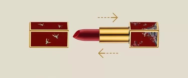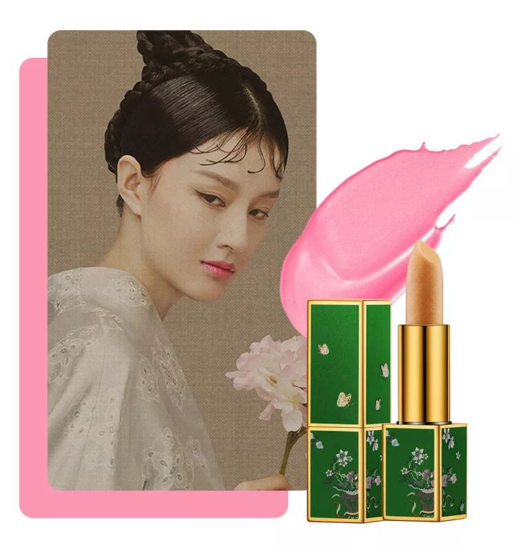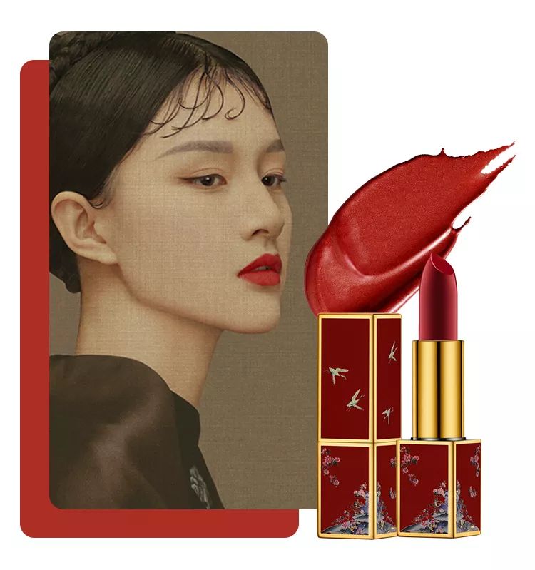 她所匹配的唇容也是力求明艳干净,郎窑红口红的外观源自洋红色缎绣百花纹夹氅衣,取胭脂江山,女主坐镇之意。
