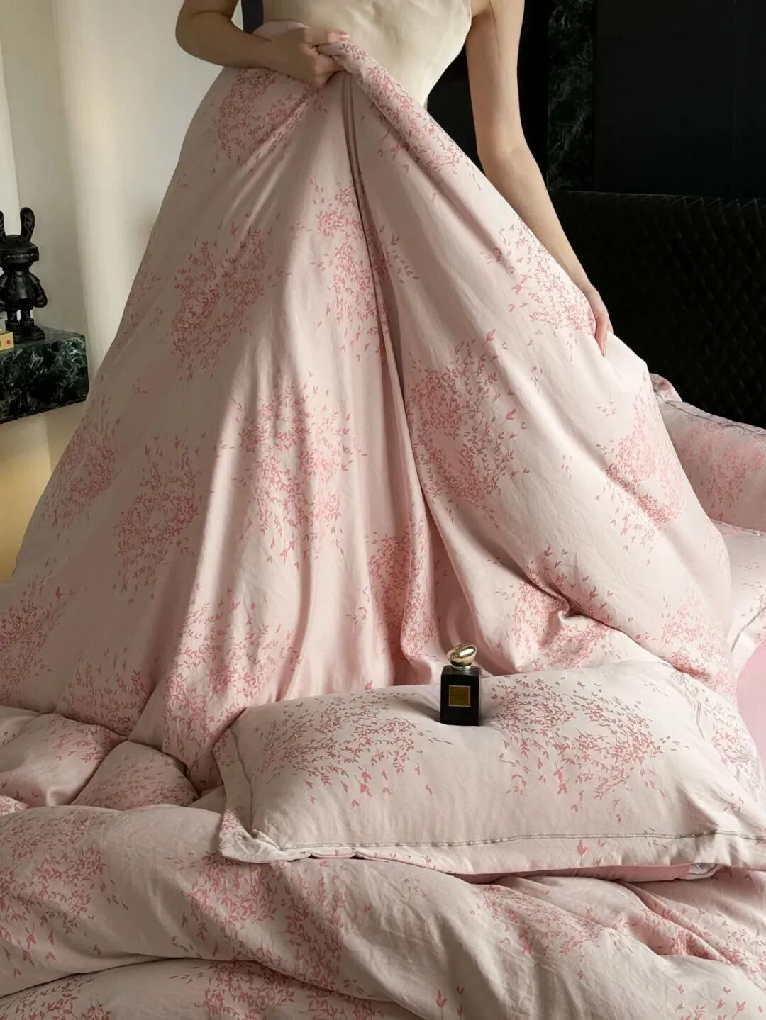 纱线越细,织得越紧密,手感如同真丝般柔软丝滑,不会粗糙刺激皮肤,适合裸睡,连敏肌都能安心使用。