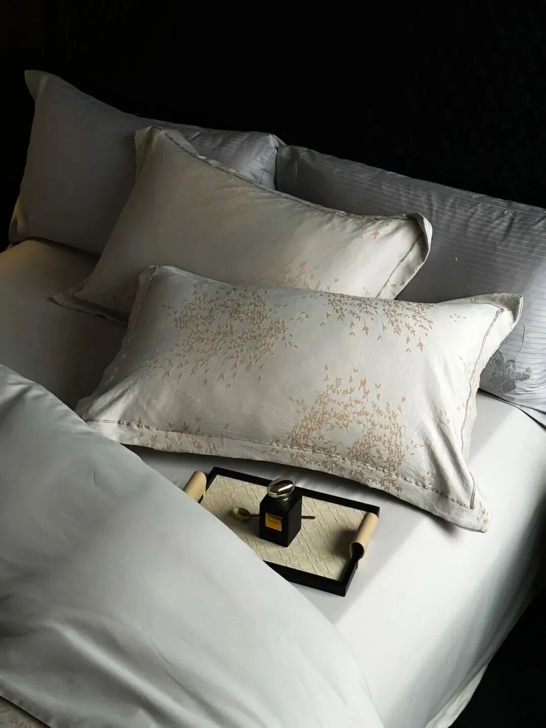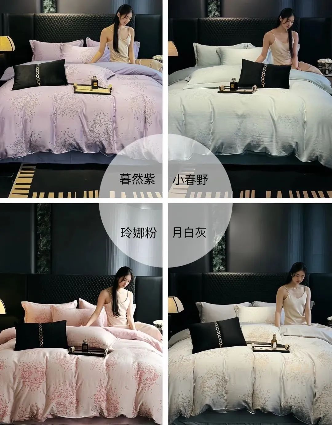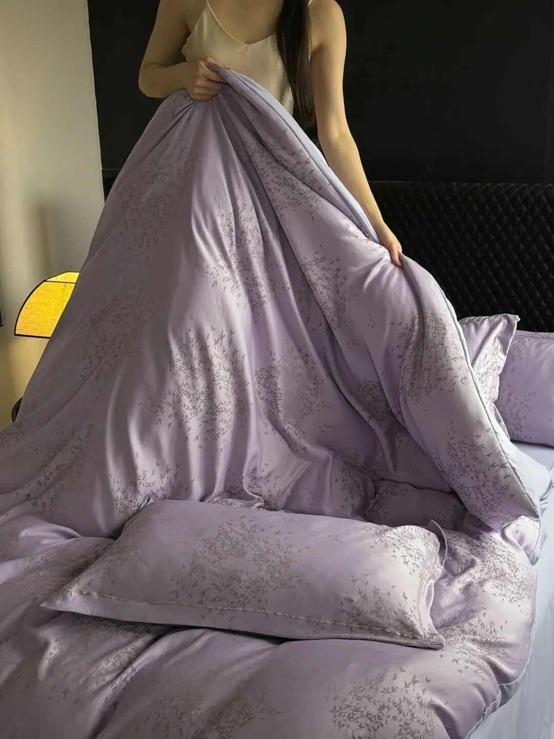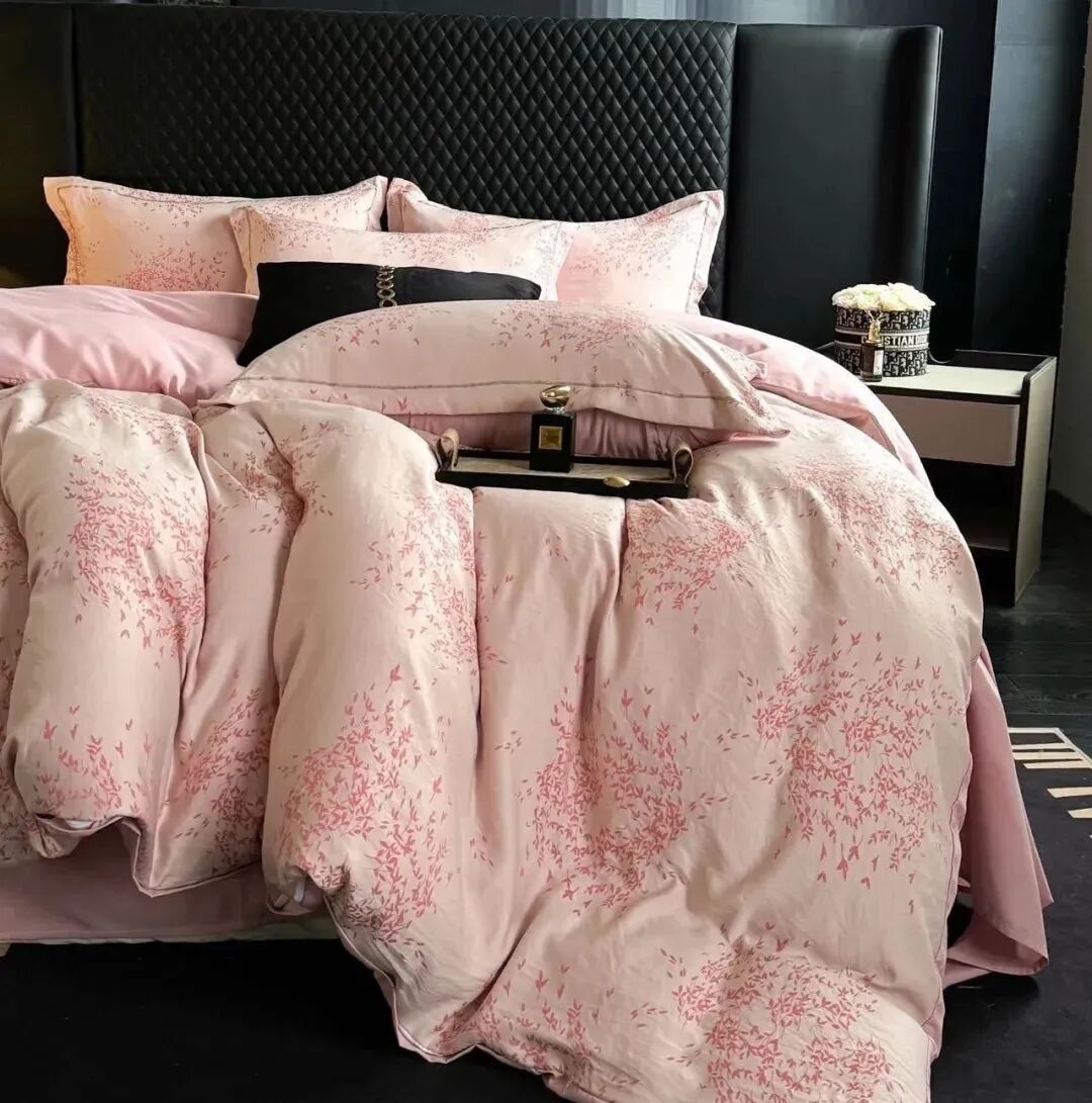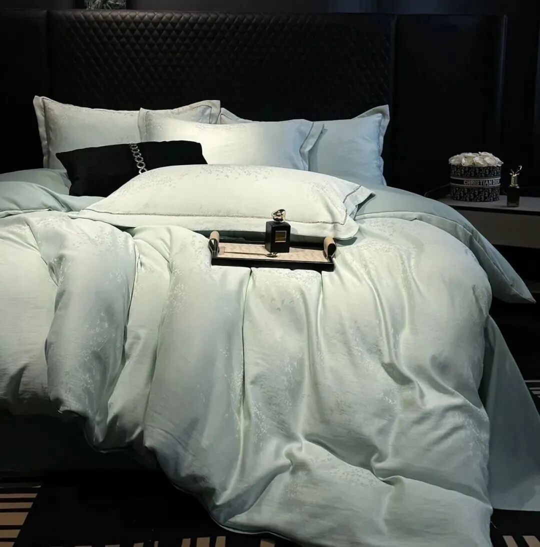 这款笙观相沐金枝玉叶四件套采用70%天丝+30%莱卡棉,亲肤排汗,光泽自然雅致,垂坠感十足
