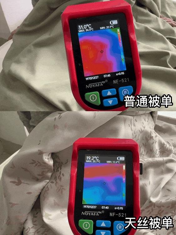为了验证它的透气性和凉感,我们做了温度对比测试:盖在身上15分钟后,普通床单身体温度约30℃左右,而天丝床单的温度约为25℃左右,足足低了5℃。