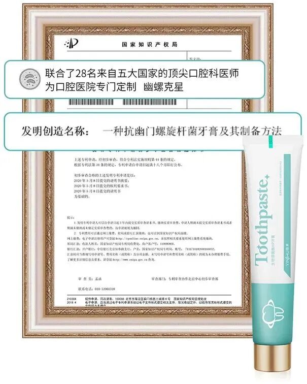 首先它不是普通的牙膏,而是获得了专利的抗幽门螺旋杆菌的牙膏。(专利号:202010380514.X)