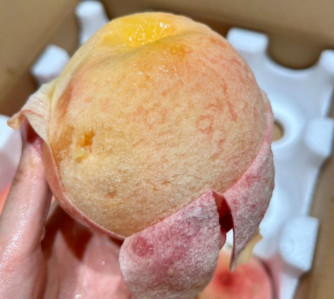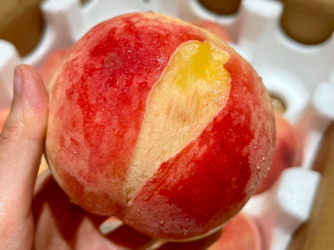 收到货后,我们可以先检查下水蜜桃的状态,轻轻按压,有轻微凹下去的痕迹就是完全成熟,汁水充沛的那种。