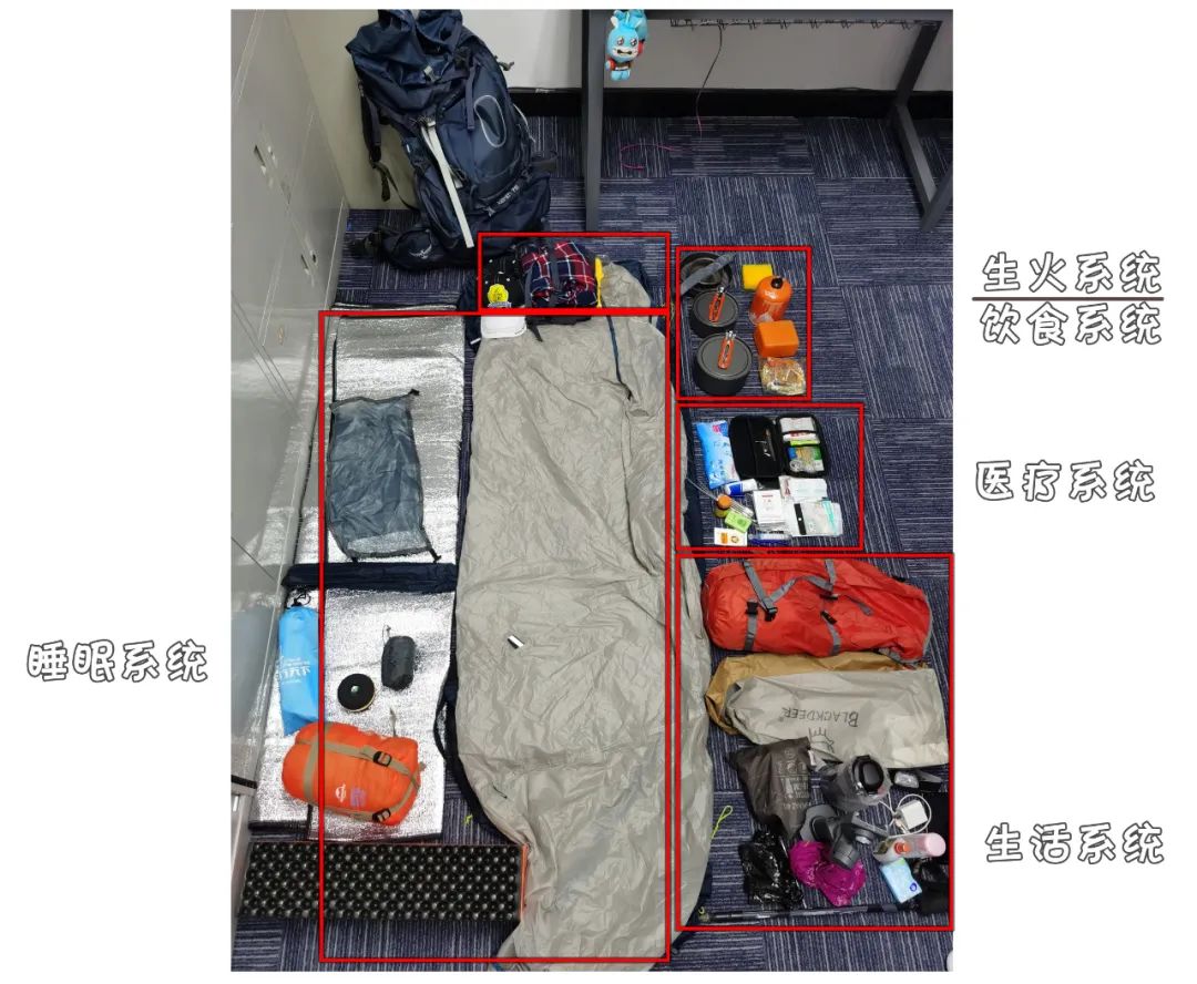 饮食系统:各类食材与调料与其密封袋;应急粮食;套锅;烧水壶;长公筷;钛碗;私人筷;水杯/水袋;