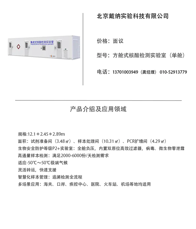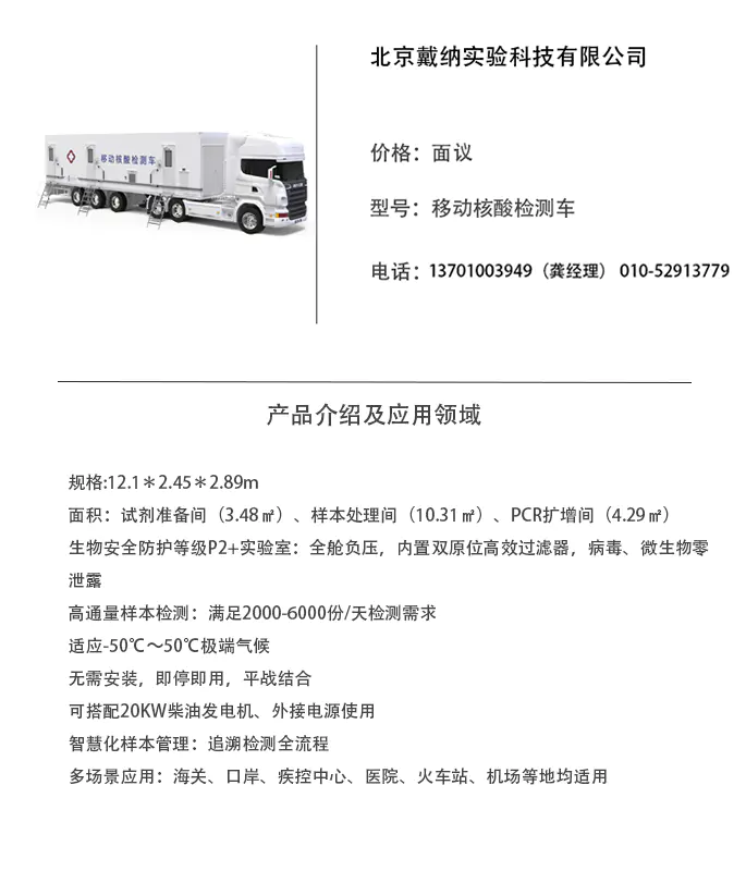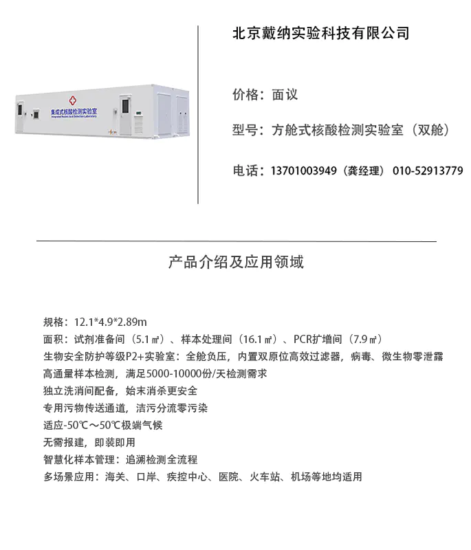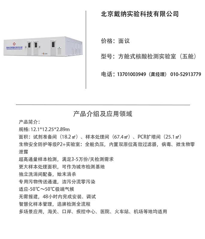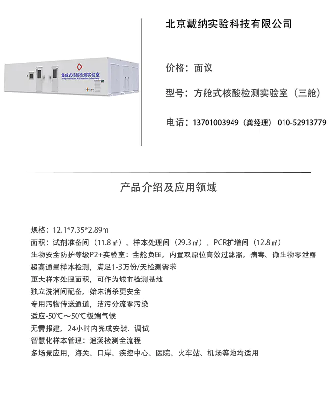 2020年6月11日,新发地疫情发生后,北京市的首例阳性病例(宣武医院)与海淀区的首例(海淀医院)均由戴纳公司提供的方舱实验室检出。2021年3月22日发布全国首个《移动式核酸检测实验室通用技术规范》、《方舱式核酸检测实验室通用技术规范》团体标准。截止目前,该产品已申请105项国家专利,其中74项为发明专利。