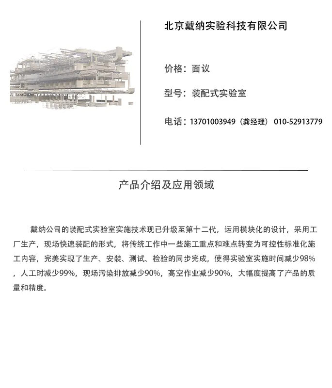 北京戴纳实验科技有限公司成立于2011年8月,是一家基于实验室行业的创新型公司,主要提供实验室设计、装配式实验室实施、方舱实验室、实验室维护、智慧实验室五项服务业务。至今已为全国600多个客户,800多万平方米实验室提供服务,于2018年获得亚洲首个国际卓越奖。业务涵盖了:化工、生物、物理、材料、电子等各领域。现公司已申请265国家项专利,其中187项为发明专利。